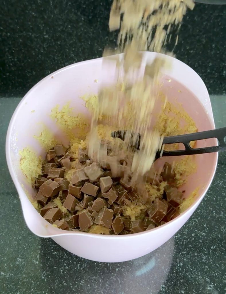 2. Tillsätt resten av ingredienserna och blanda ihop till en deg. Rör sist ner chokladen.