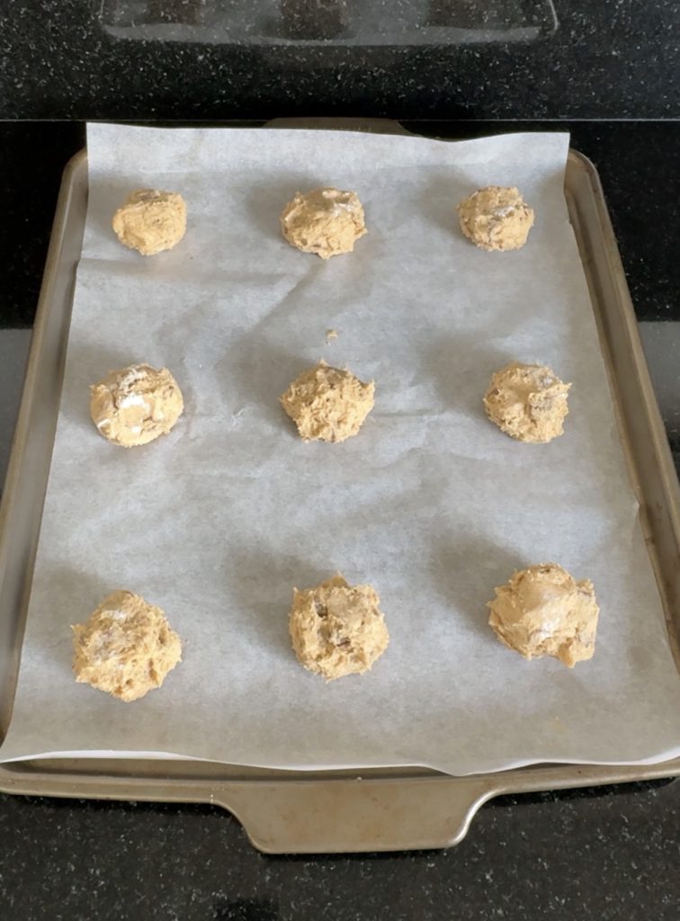 4. Lägg bollarna på en plåt med bakplåtspapper (8 stycken på varje plåt för de flyter ut). Platta till bollarna lite lätt.