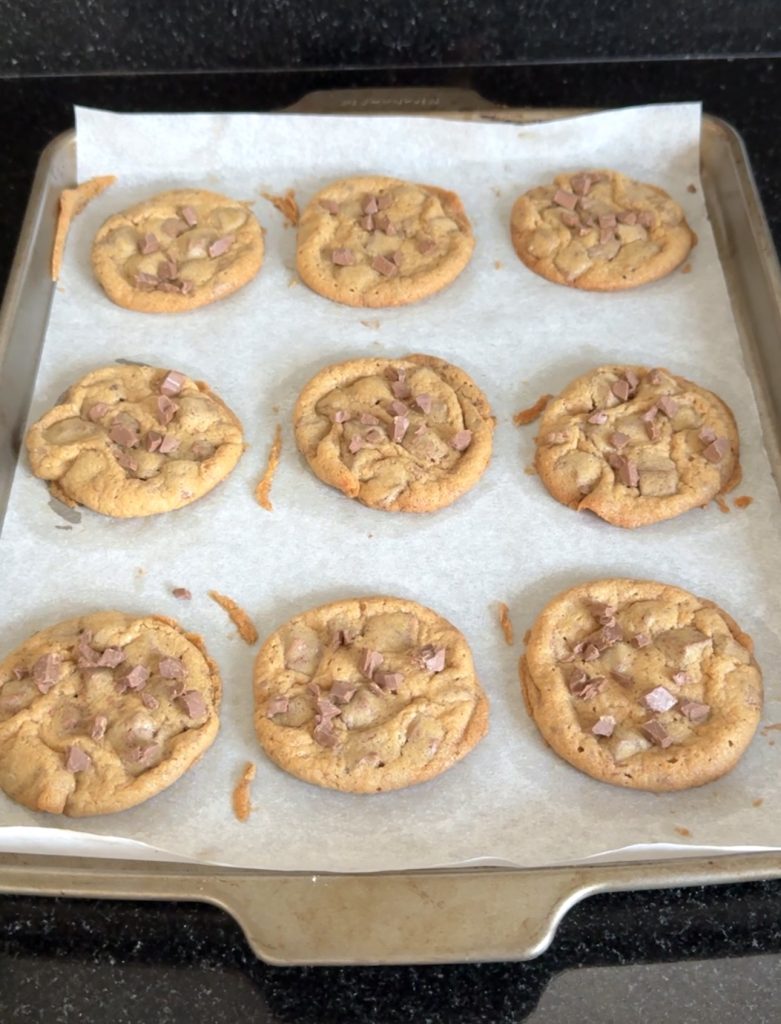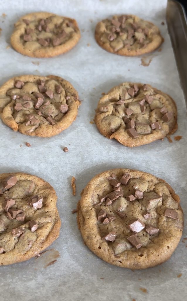 7. Lägg gärna på lite extra chokladknappar medan kakorna fortfarande är varma (eller hackad choklad på ytan eftersom chokladen åker in i kakan under gräddningen.)