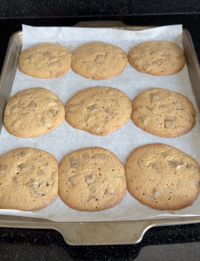 7. Lägg gärna på lite extra chokladknappar medan kakorna fortfarande är varma (eller hackad choklad på ytan eftersom chokladen åker in i kakan under gräddningen.)