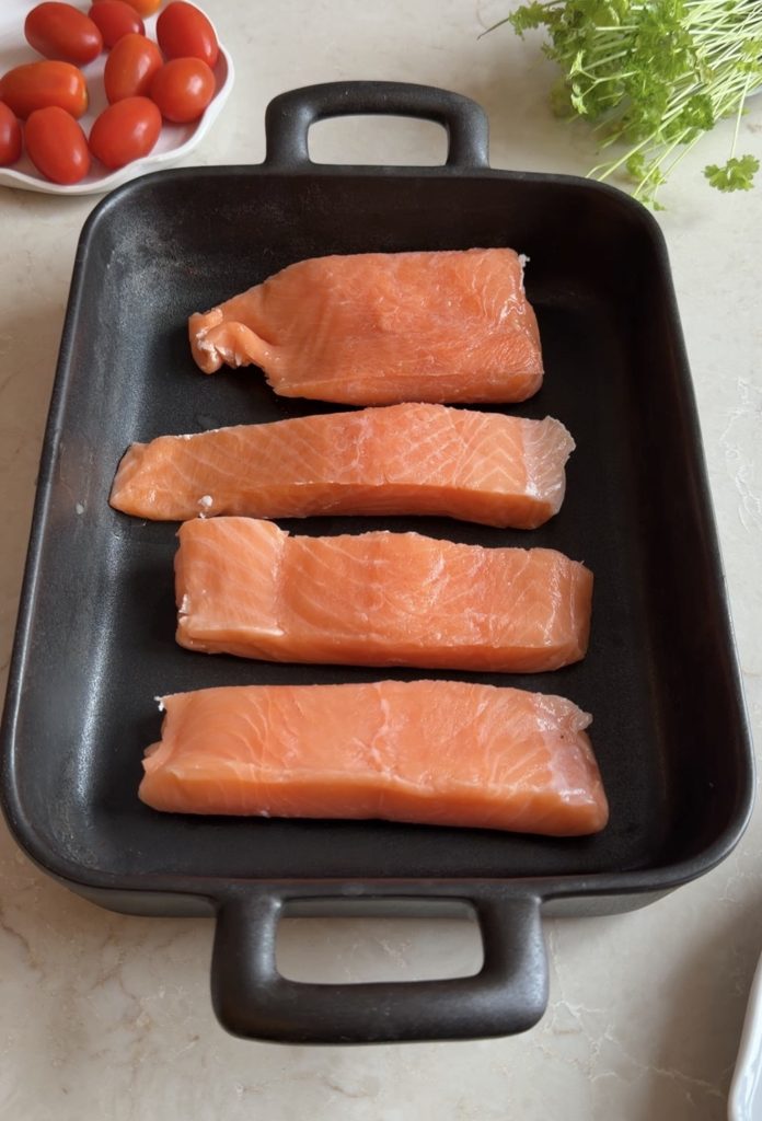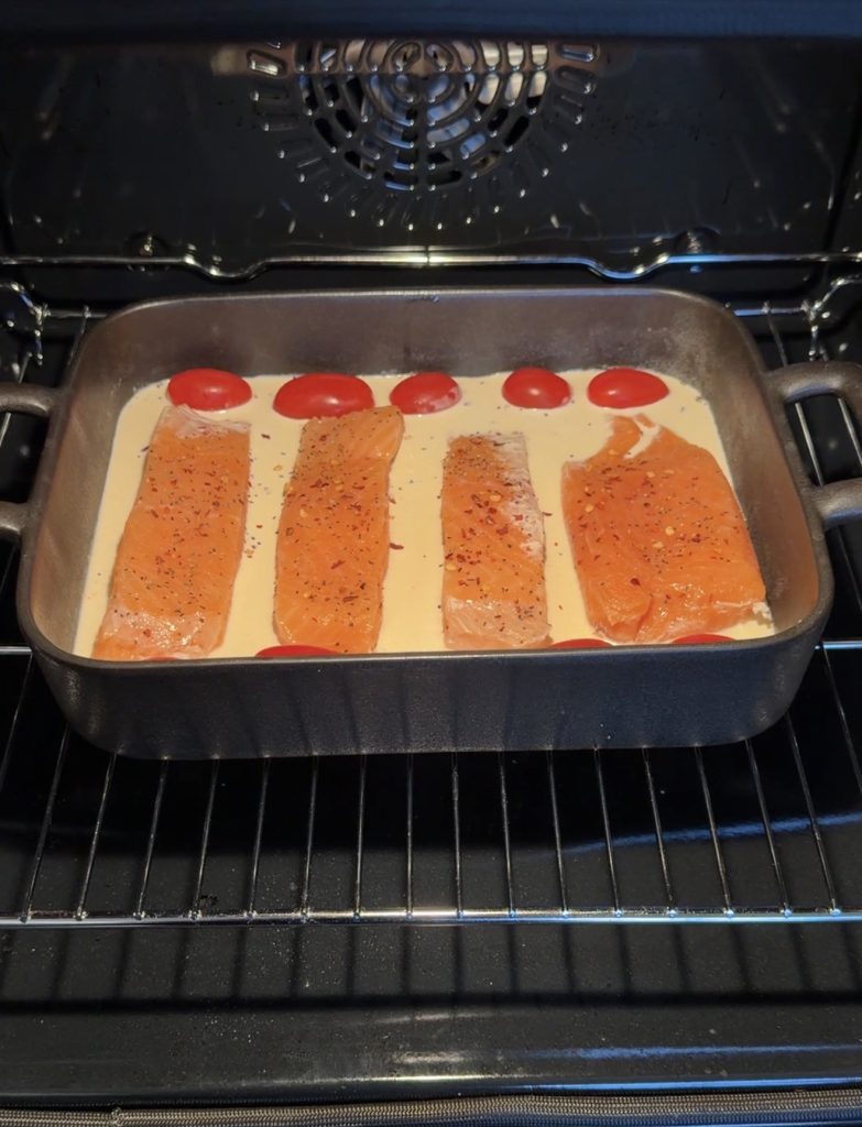 1. Sätt ugnen på 150 grader. Lägg laxbitarna i en ugnsform (inte förs stor eftersom såsen ska ligga runt laxen).
