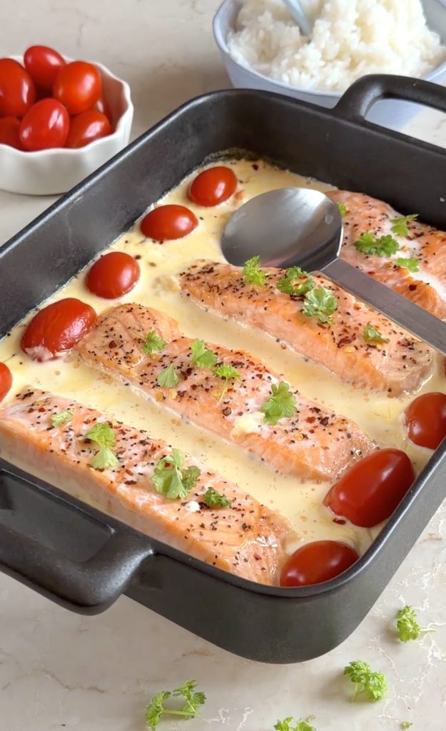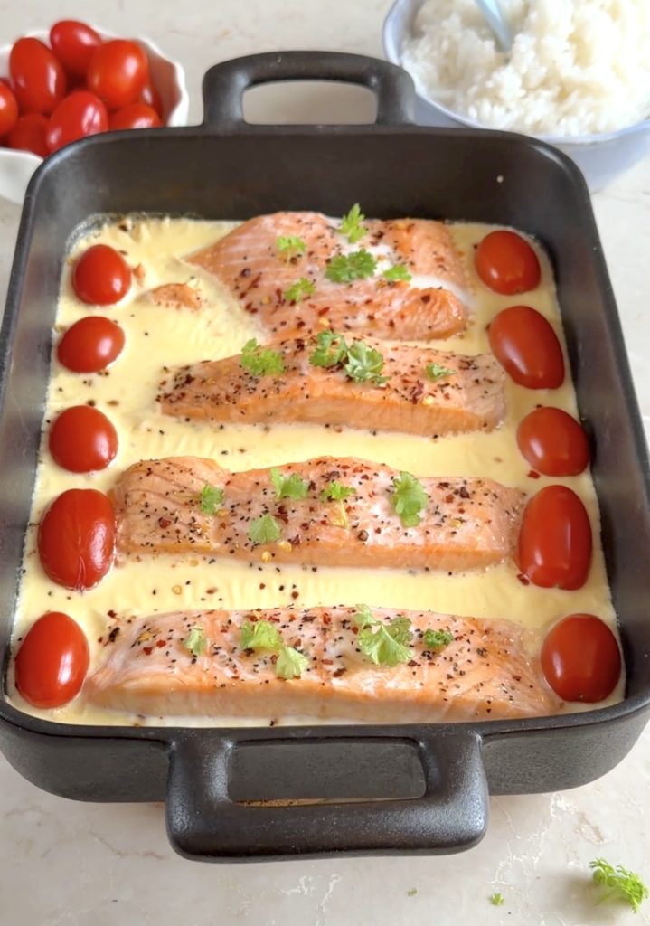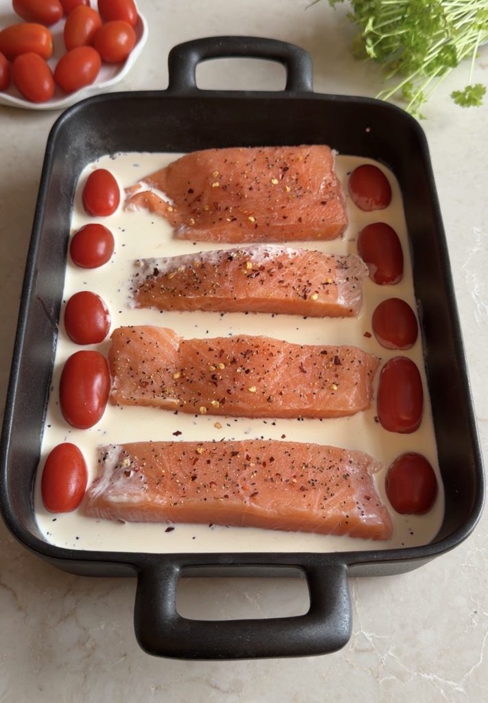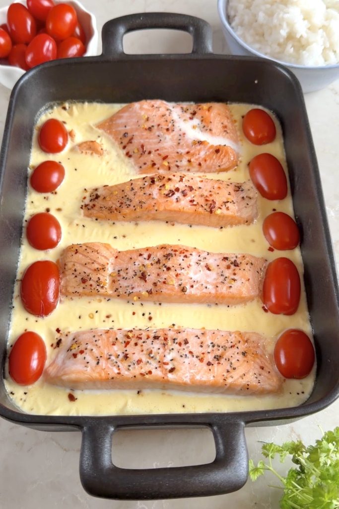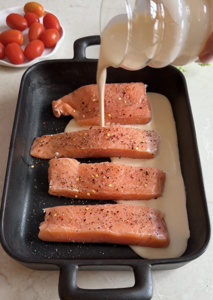 3. Blanda såsens ingredienser och häll den runt om laxbitarna.