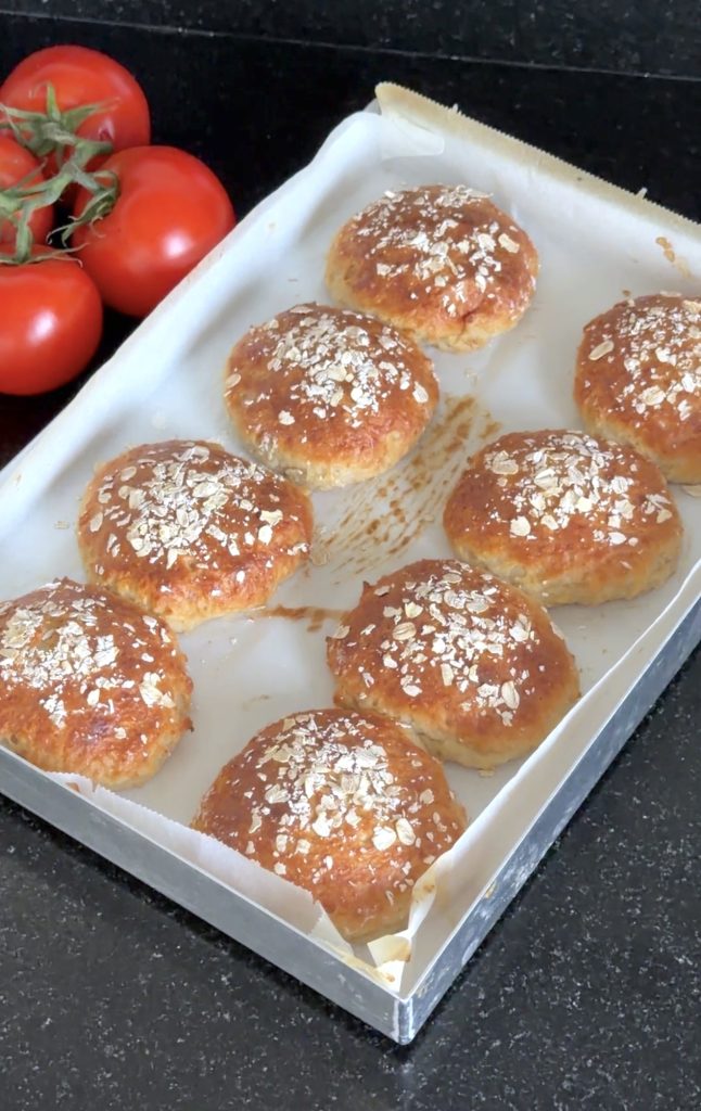 6. Grädda bröden längst ner i ugnen i ca 20 min, till de får en gyllenbrun färg. Låt bröden kallna innan du delar dem med en kniv.