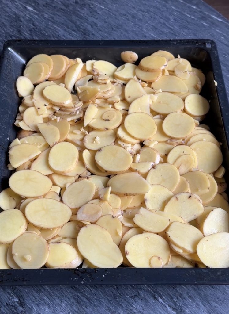- Sätt ugnen på 225 grader. Skär potatisarna i tunna skivor eller använd en mandolin eller köksmaskin.