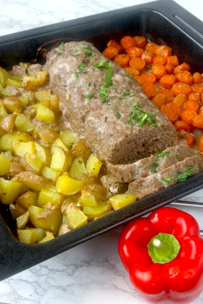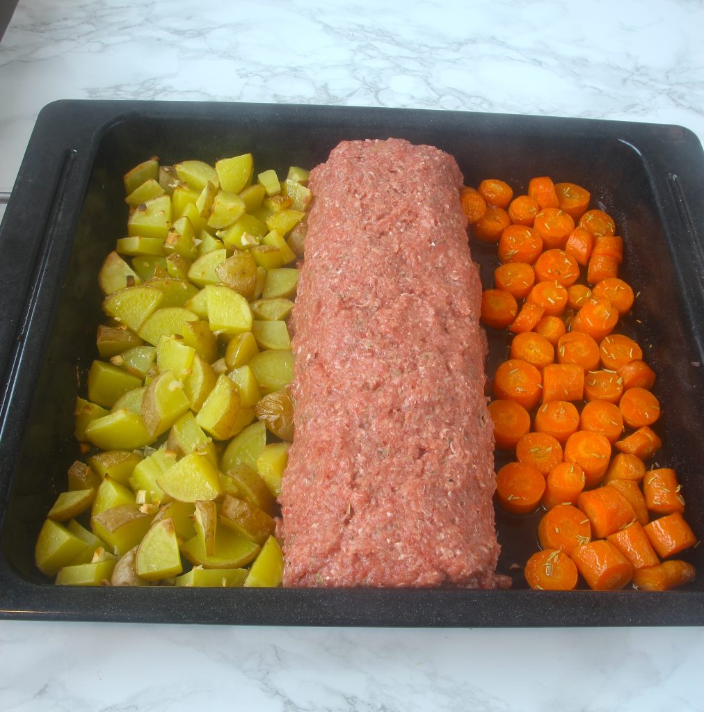 1. Sätt ugnen på 250 grader. Skär potatisen och morötterna i bitar. Lägg dem utåt kanterna på en ugnsplåt (lämna ca 15 cm i mitten där köttfärslimpan ska ligga).