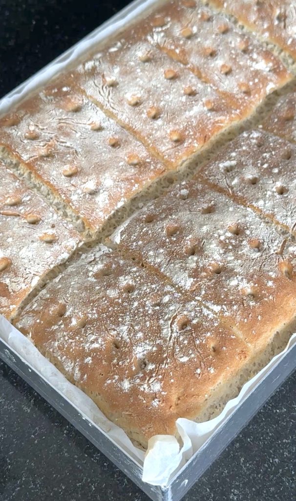 4. Stjälp ut degen i Lindas ugnsplåt, klädd med bakplåtspapper. Strö över lite mjöl och platta ut degen till en rektangel med mjölade händer.