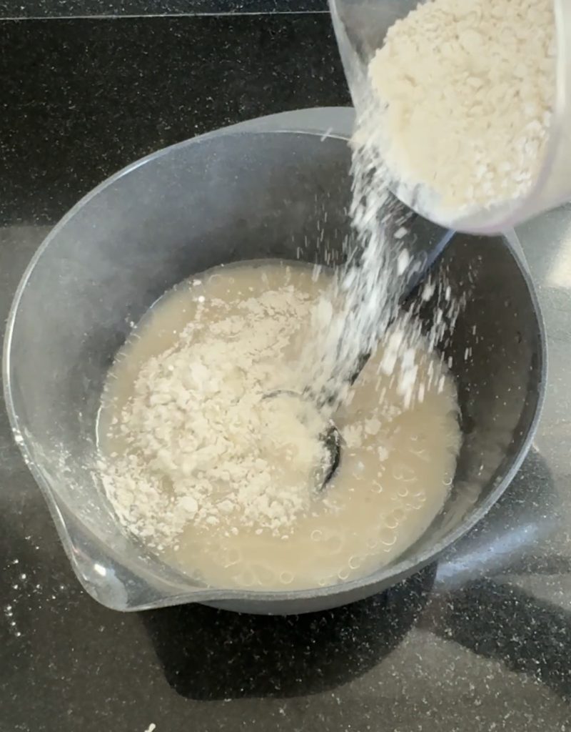 1. Smula ner jästen i en bunke. Tillsätt vatten och rör om ordentligt.