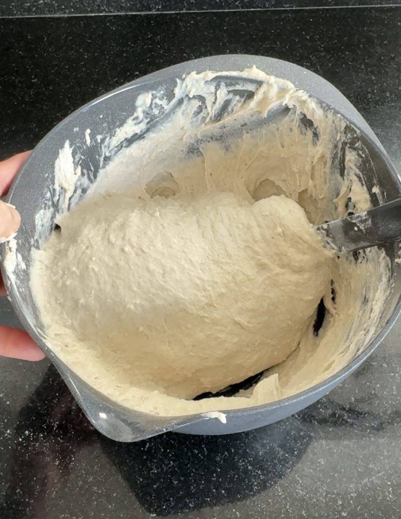 3. Tillsätt mjölet, lite i taget och rör om med en slev till en lätt kladdig deg. Du behöver inte knåda degen utan rör om tills det blir en lätt kladdig deg.