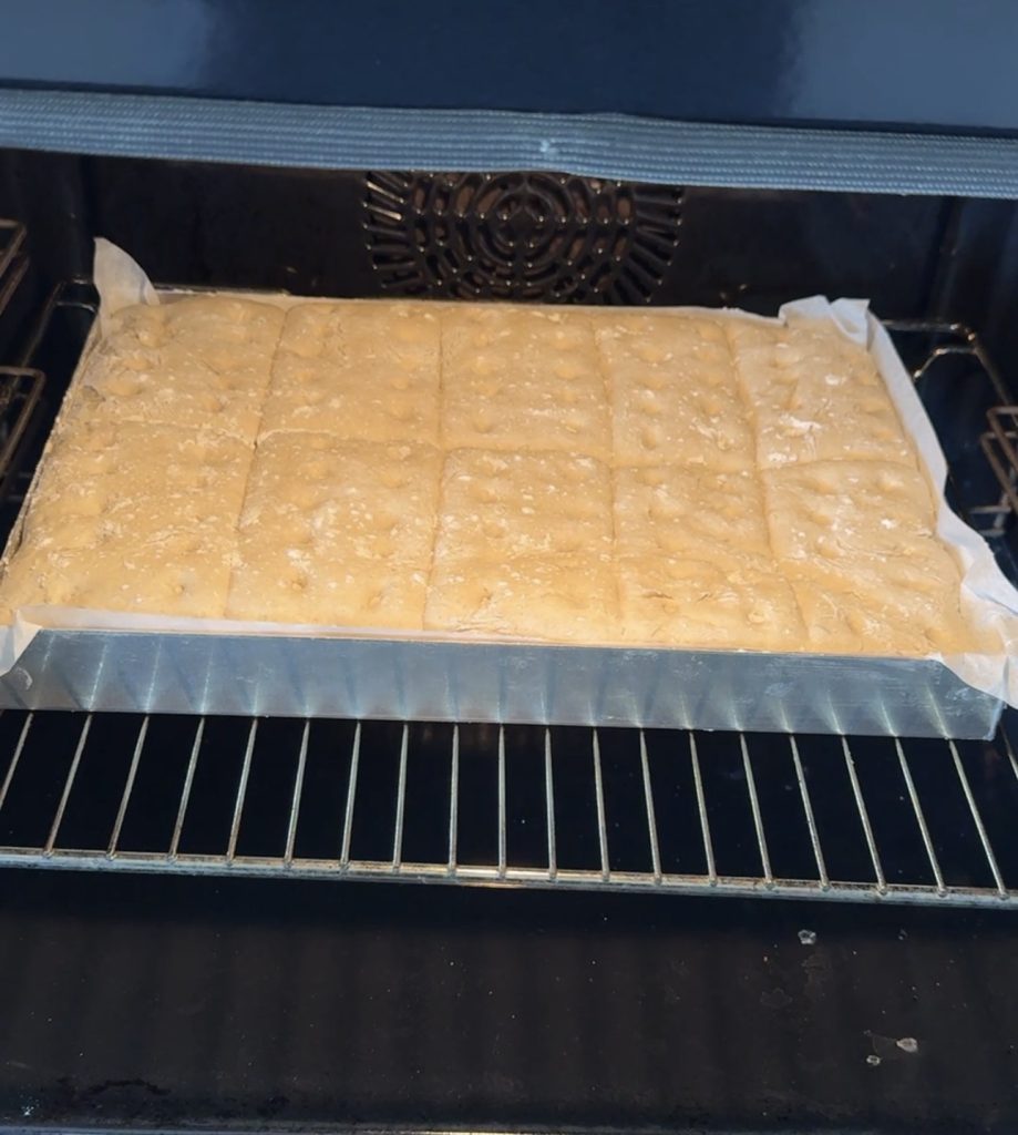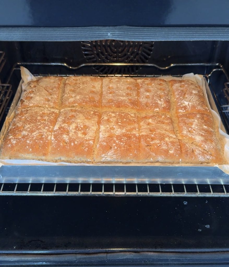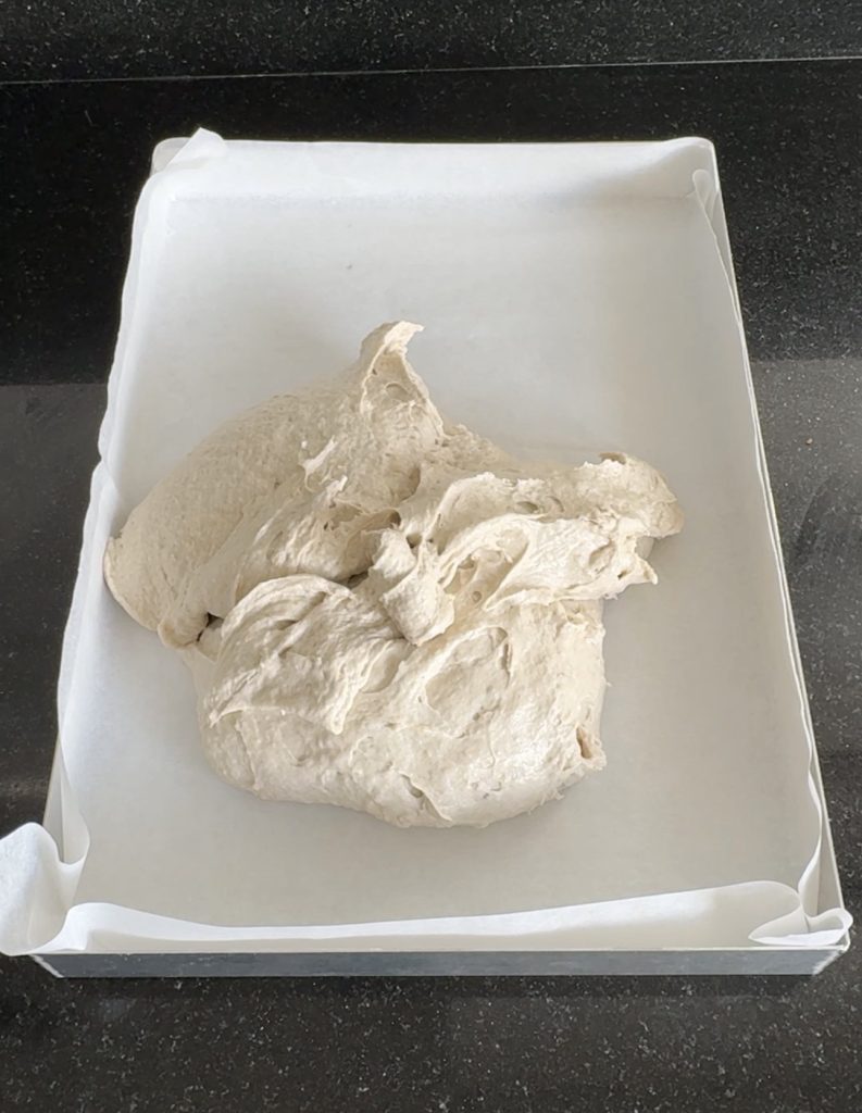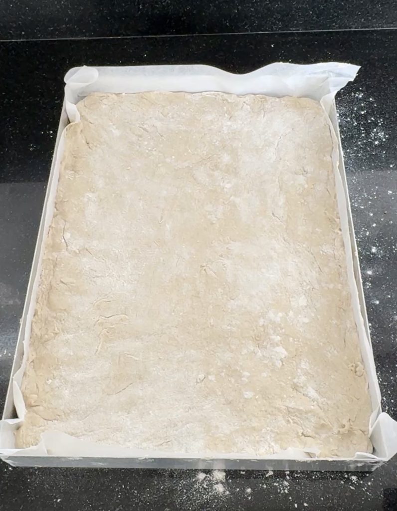 4. Stjälp ut degen i Lindas ugnsplåt, klädd med bakplåtspapper. Strö över lite mjöl och platta ut degen till en rektangel med mjölade händer.