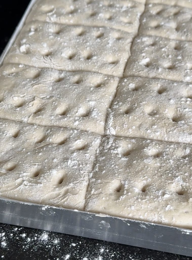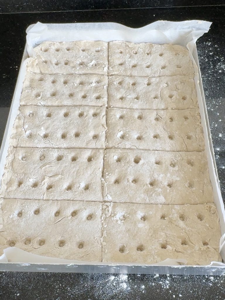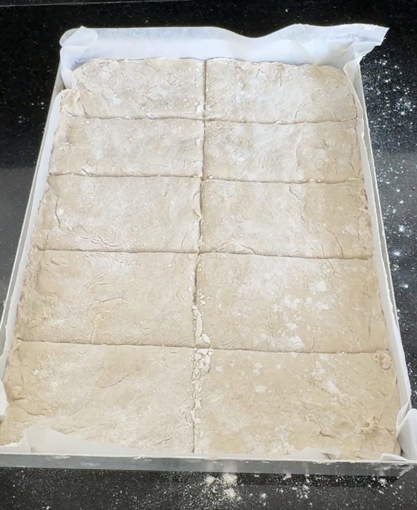 5. Skär degen i tio rutor med en degskrapa och nagga hål i degen med t ex ett sugrör eller en gaffel.