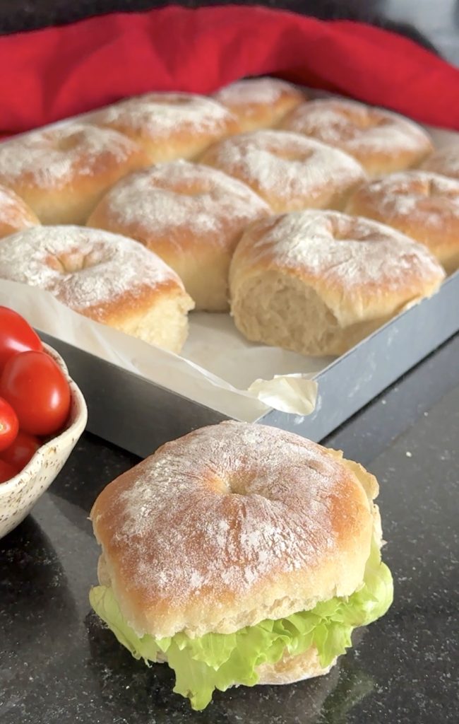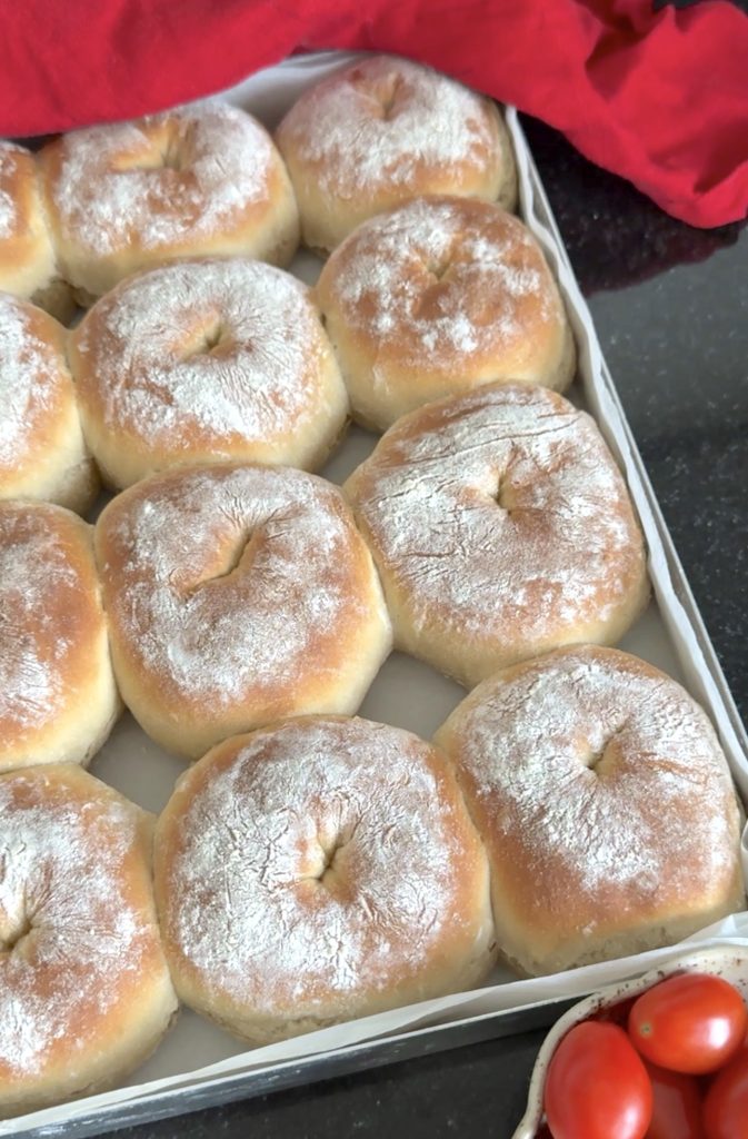 3. Lägg 12 frallor på en på Lindas ugnsplåt, klädd med bakplåtspapper. (Grädda de åtta resterande frallorna efter denna omgång). Låt dem jäsa under bakduk i ca 25 min. Sätt ugnen på 230 grader.