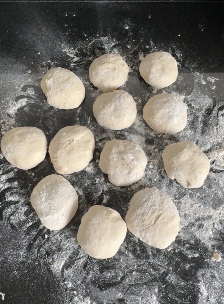 2. Dela degen i 20 bitar. Rulla dem till bollar. Gör ett hål i varje fralla, ca 2 cm brett med mjölade händer.