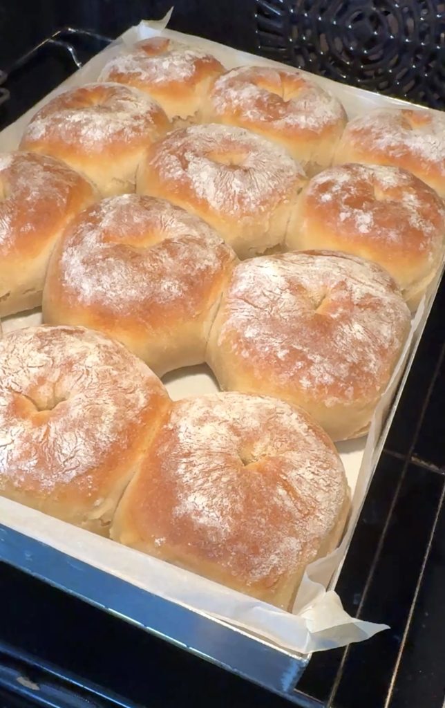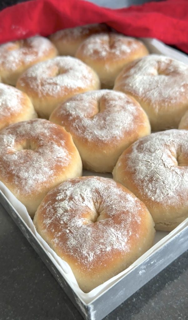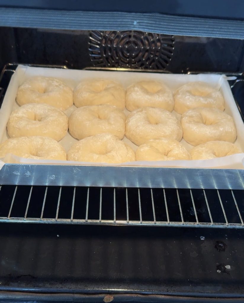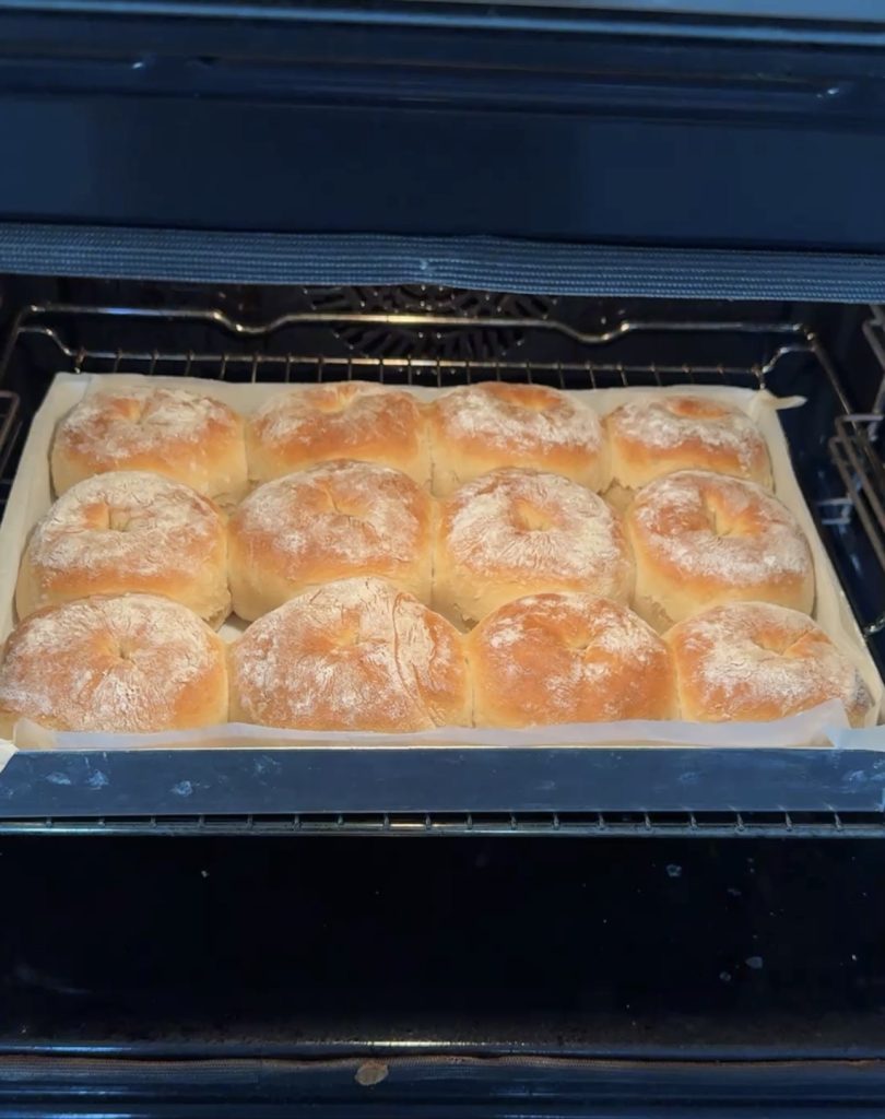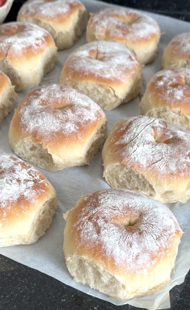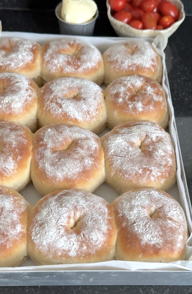 3. Lägg 12 frallor på en på Lindas ugnsplåt, klädd med bakplåtspapper. (Grädda de åtta resterande frallorna efter denna omgång). Låt dem jäsa under bakduk i ca 25 min. Sätt ugnen på 230 grader.