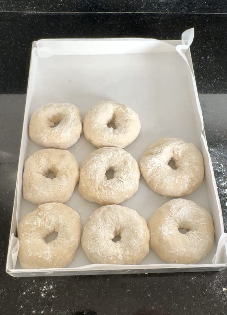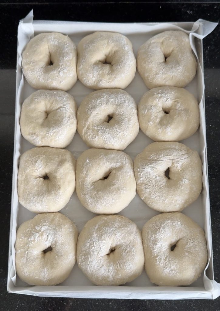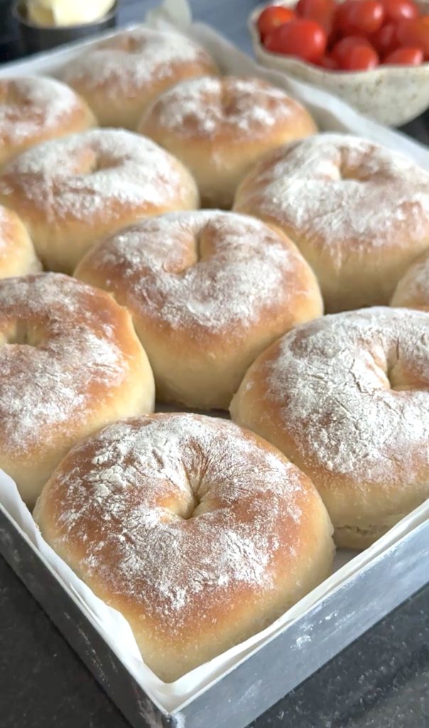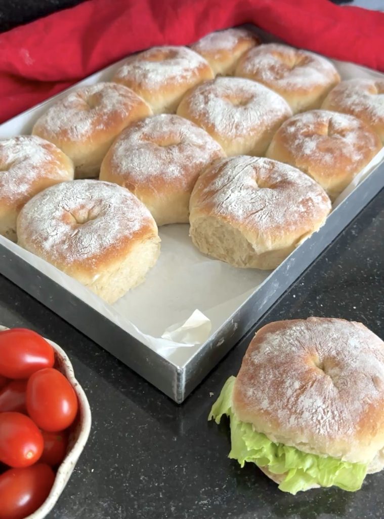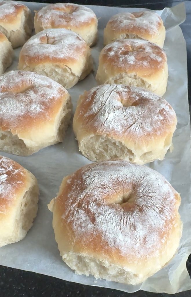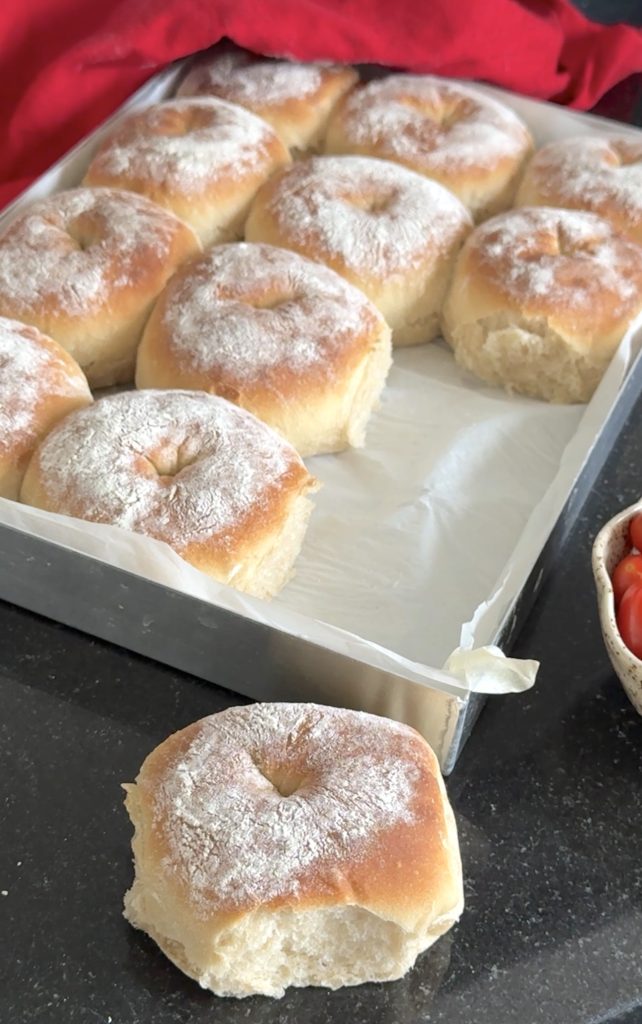 3. Lägg 12 frallor på en på Lindas ugnsplåt, klädd med bakplåtspapper. (Grädda de åtta resterande frallorna efter denna omgång). Låt dem jäsa under bakduk i ca 25 min. Sätt ugnen på 230 grader.