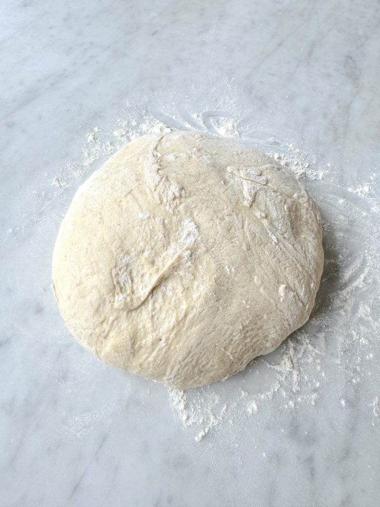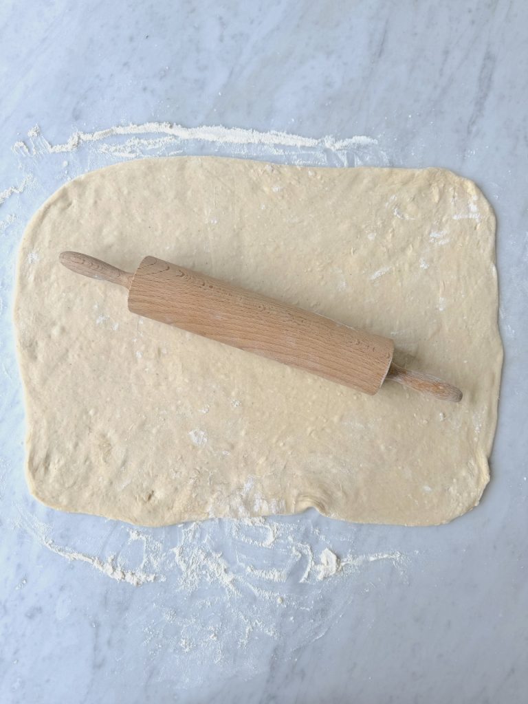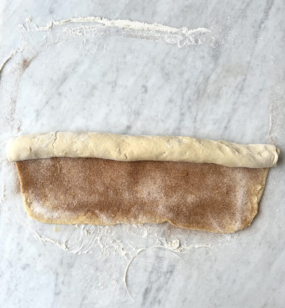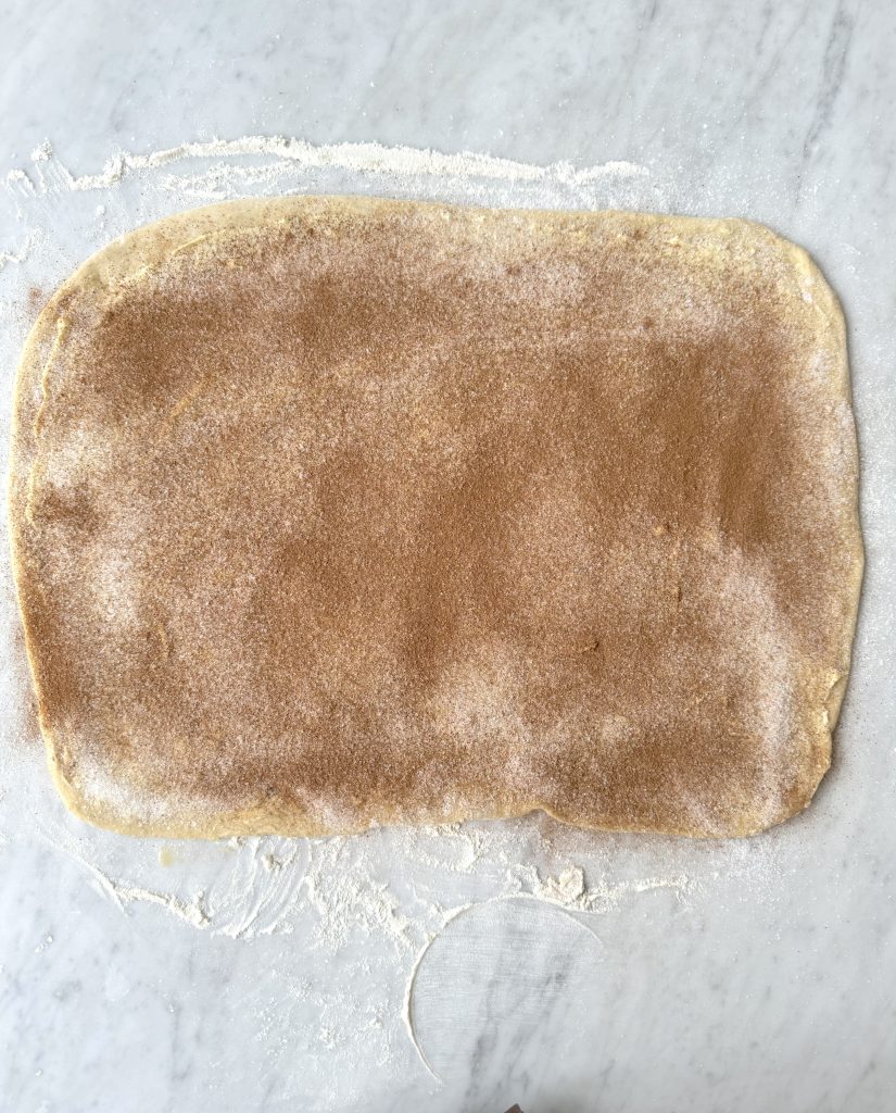 3. Knåda igenom degen och kavla ut den till en rektangel, ca 1 cm tunn på ett mjölat bakbord. Bred ut smöret på degen och strö över strösocker, vaniljsocker och kanel.