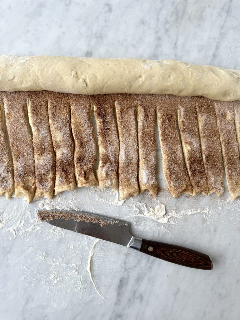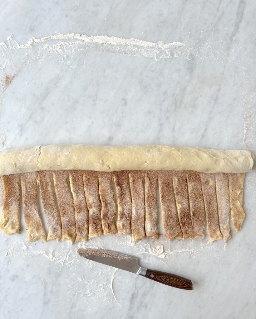 4. Rulla ihop halva degen på längden till en rulle. Skär remsor, ca 2 cm breda av degen som inte är ihoprullad.