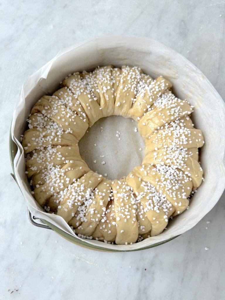 7. Pensla degen med uppvispat ägg och strö över pärlsocker. Låt degen jäsa i formen utan bakduk i ca 25 min. Sätt ugnen på 225 grader.