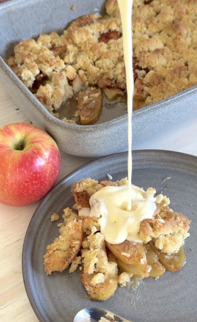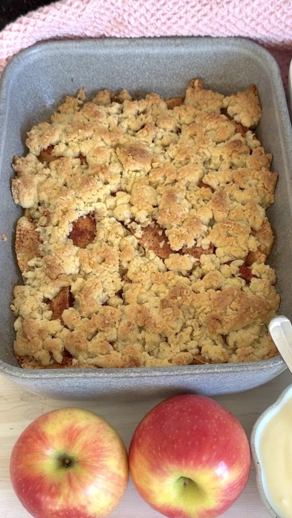 Krispigt smultäcke på äpplen – serverad med en klick vaniljsås eller glass. Magiskt god paj! Det blir inte mycket bättre än så här. Perfekt att baka när helgen närmar sig eller när man vill unna sig något extra gott.🍎 Servera med en god vaniljsås – recept finns här!