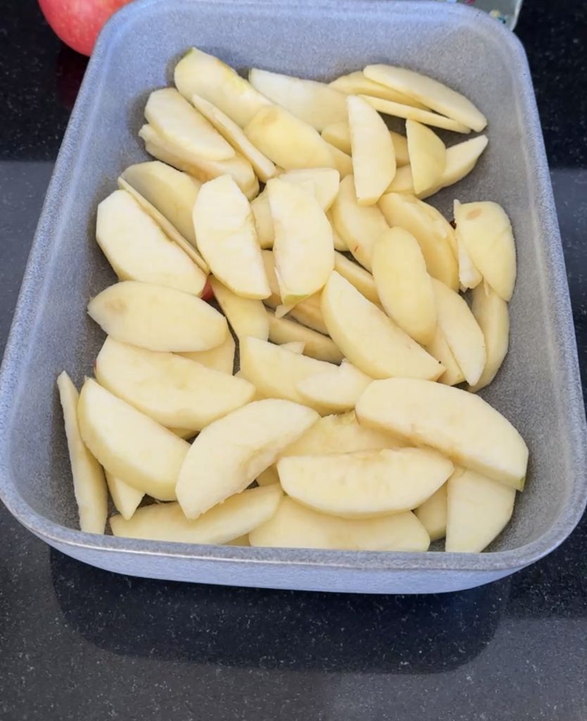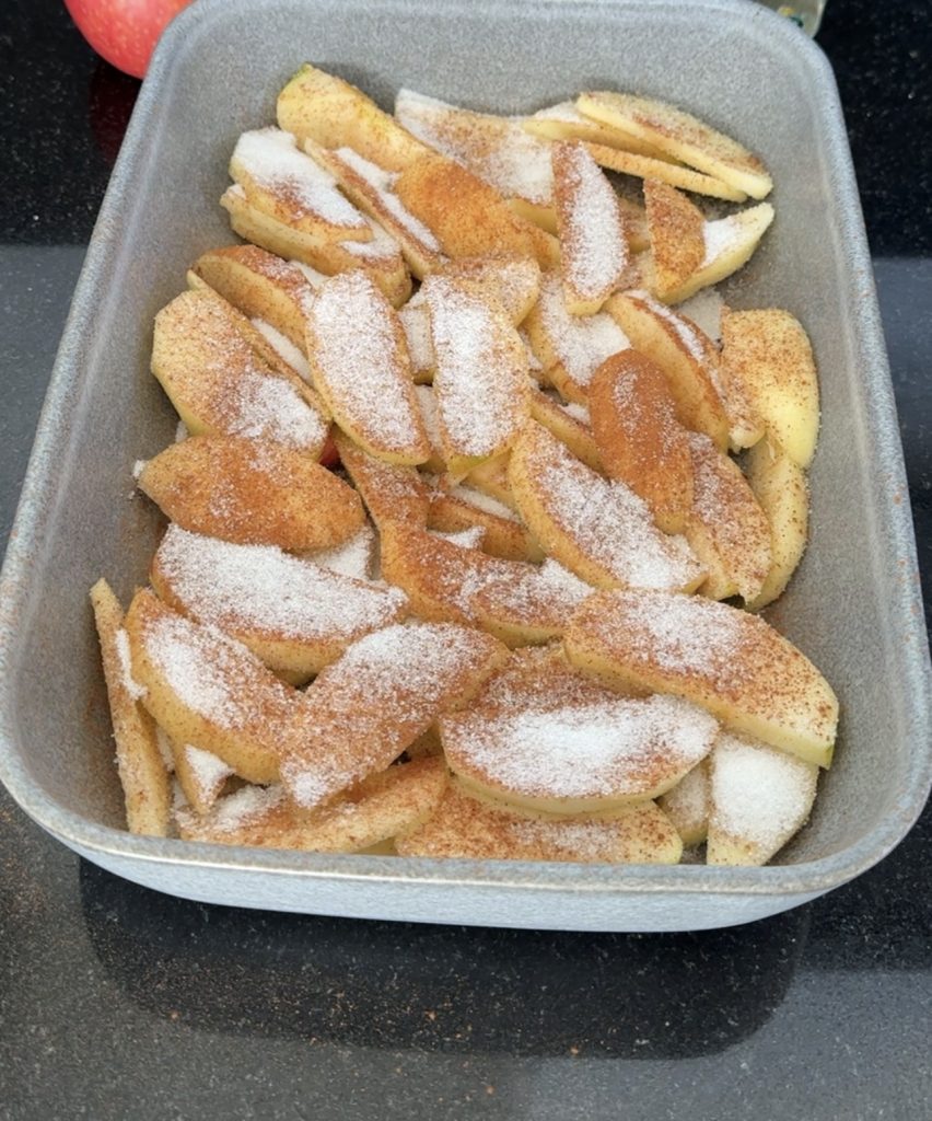 2. Skala äpplena och skär dem i skivor. Lägg äppelbitarna i en ugnsform (ca 20×25 cm eller en rund pajform, ca 26 cm i diameter). Strö över kanel och strösocker.