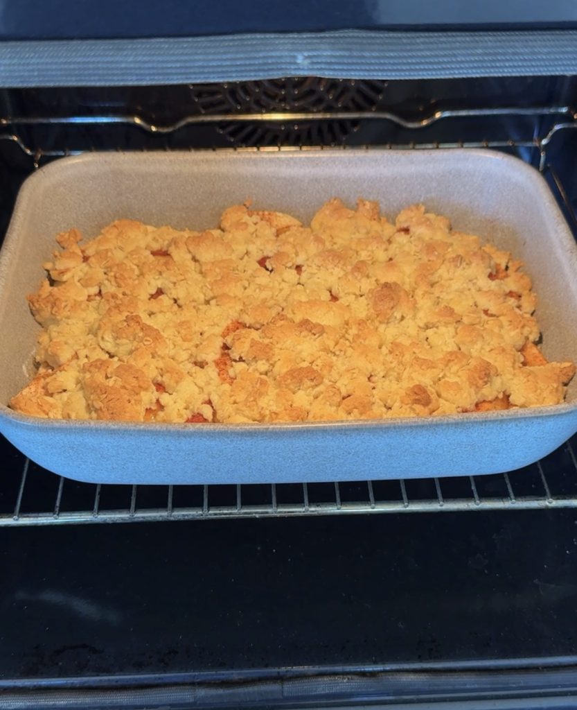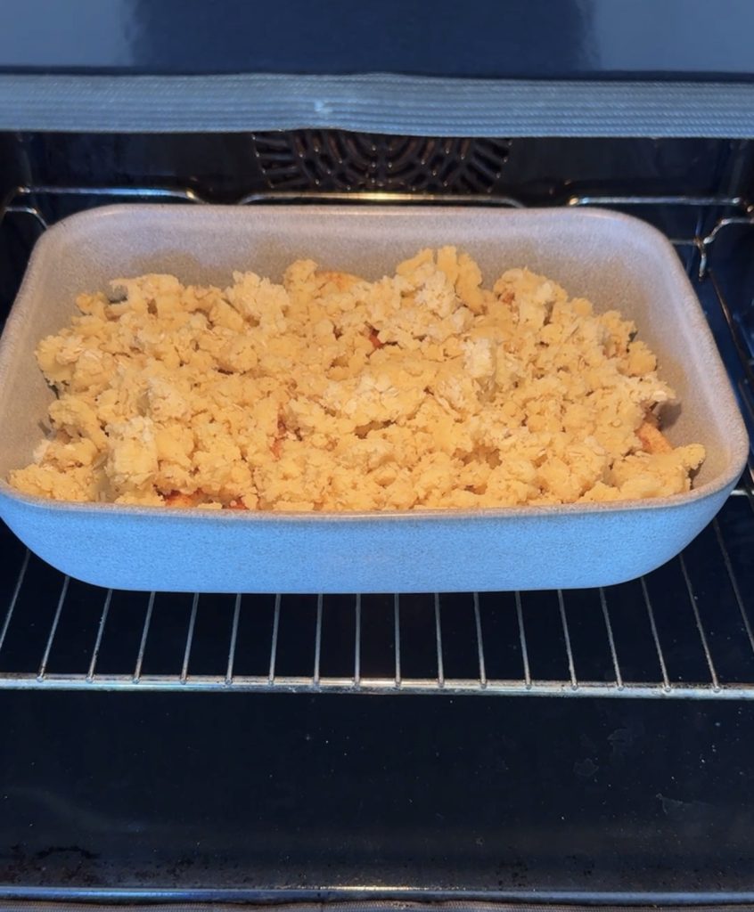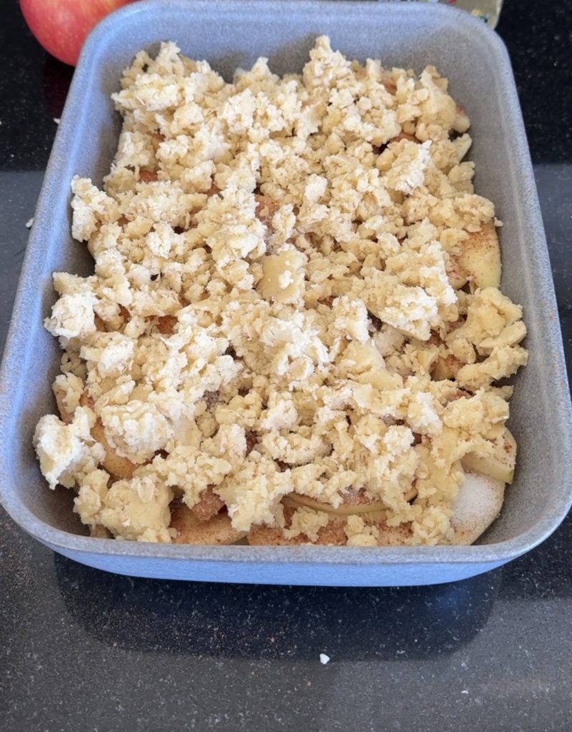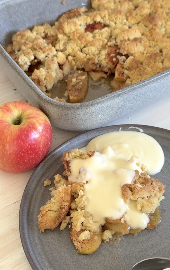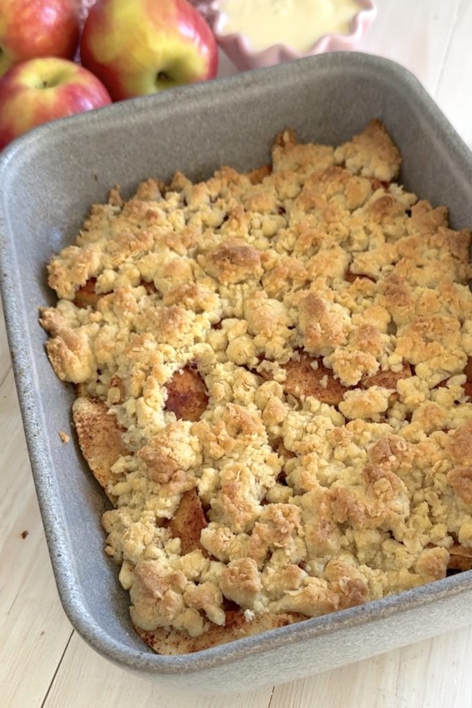 Krispigt smultäcke på äpplen – serverad med en klick vaniljsås eller glass. Magiskt god paj! Det blir inte mycket bättre än så här. Perfekt att baka när helgen närmar sig eller när man vill unna sig något extra gott.🍎 Servera med en god vaniljsås – recept finns här!
