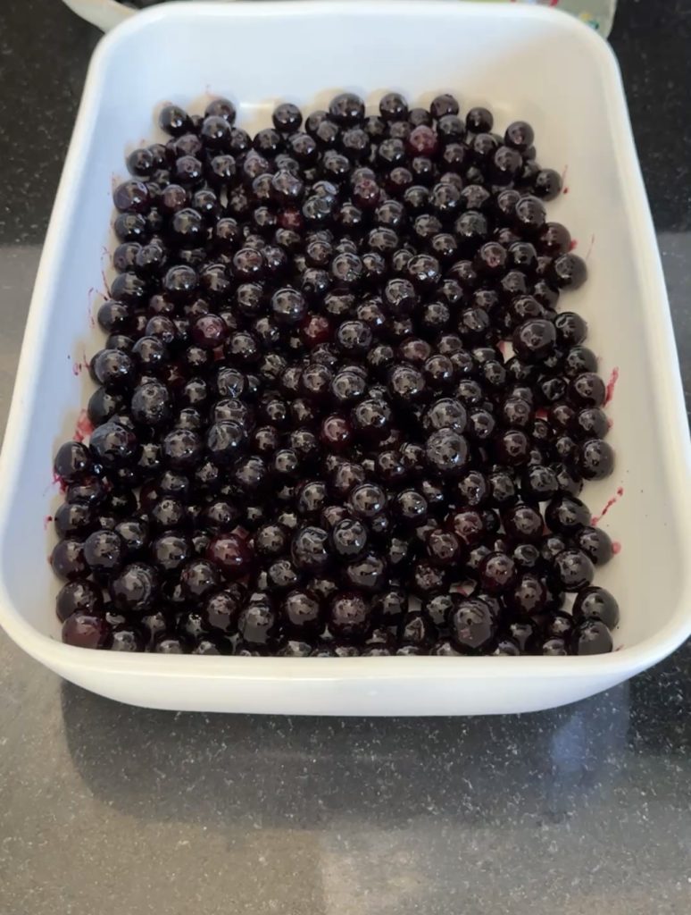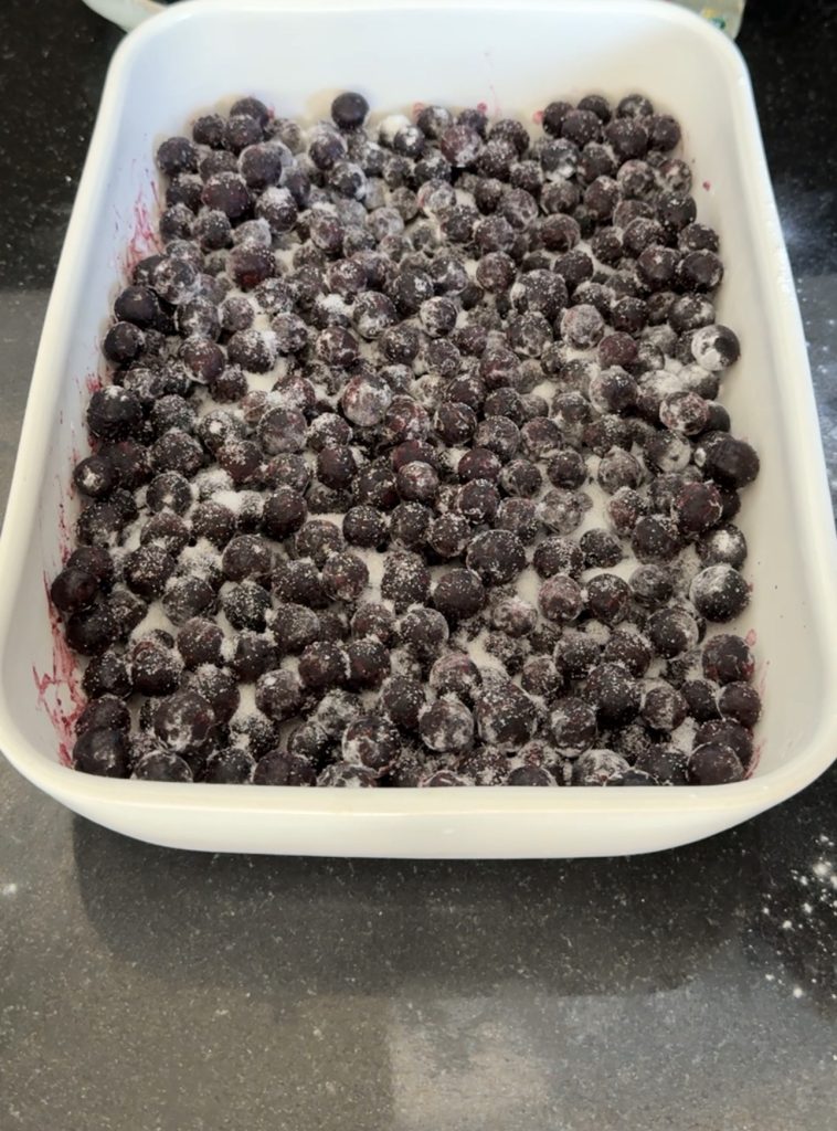 2. Lägg blåbären i en pajform (ca 20×25 cm eller en rund pajform, ca 26 cm i diameter). Strö över potatismjöl och strösocker och rör försiktigt om.