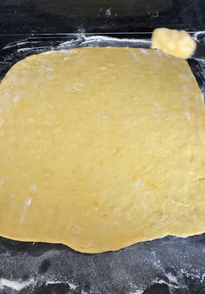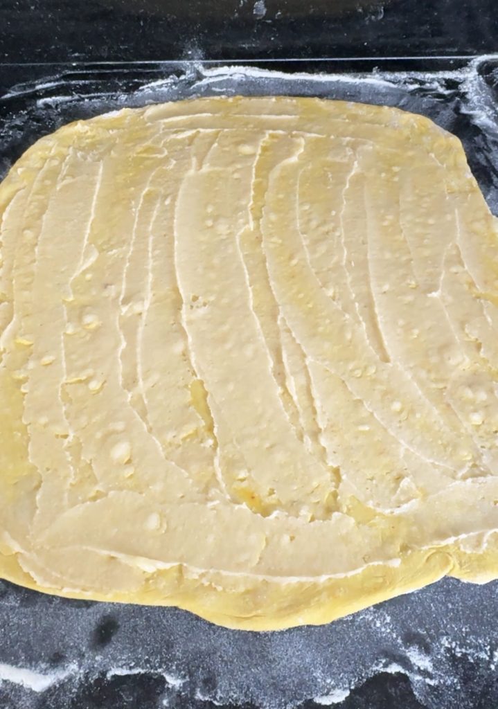 3. Fyllning: Mosa ihop smör, strösocker och kanel. Bred ut hÀlften av fyllningen pÄ rektangeln.