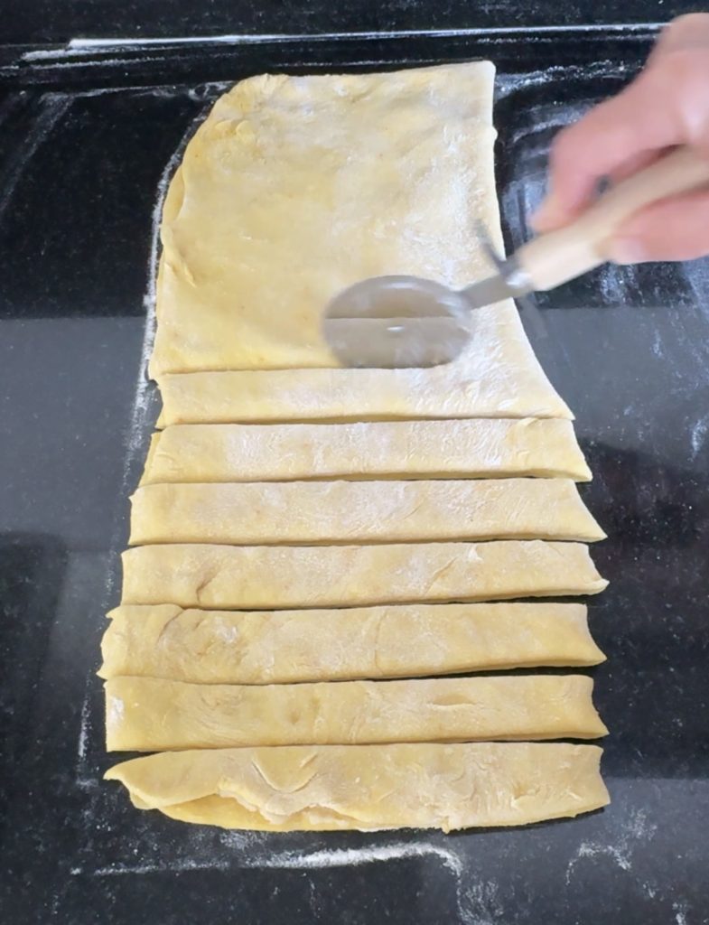 4. Vik rektangeln pÄ mitten. SkÀr remsor, ca 2 cm breda med en pizzaslicer.