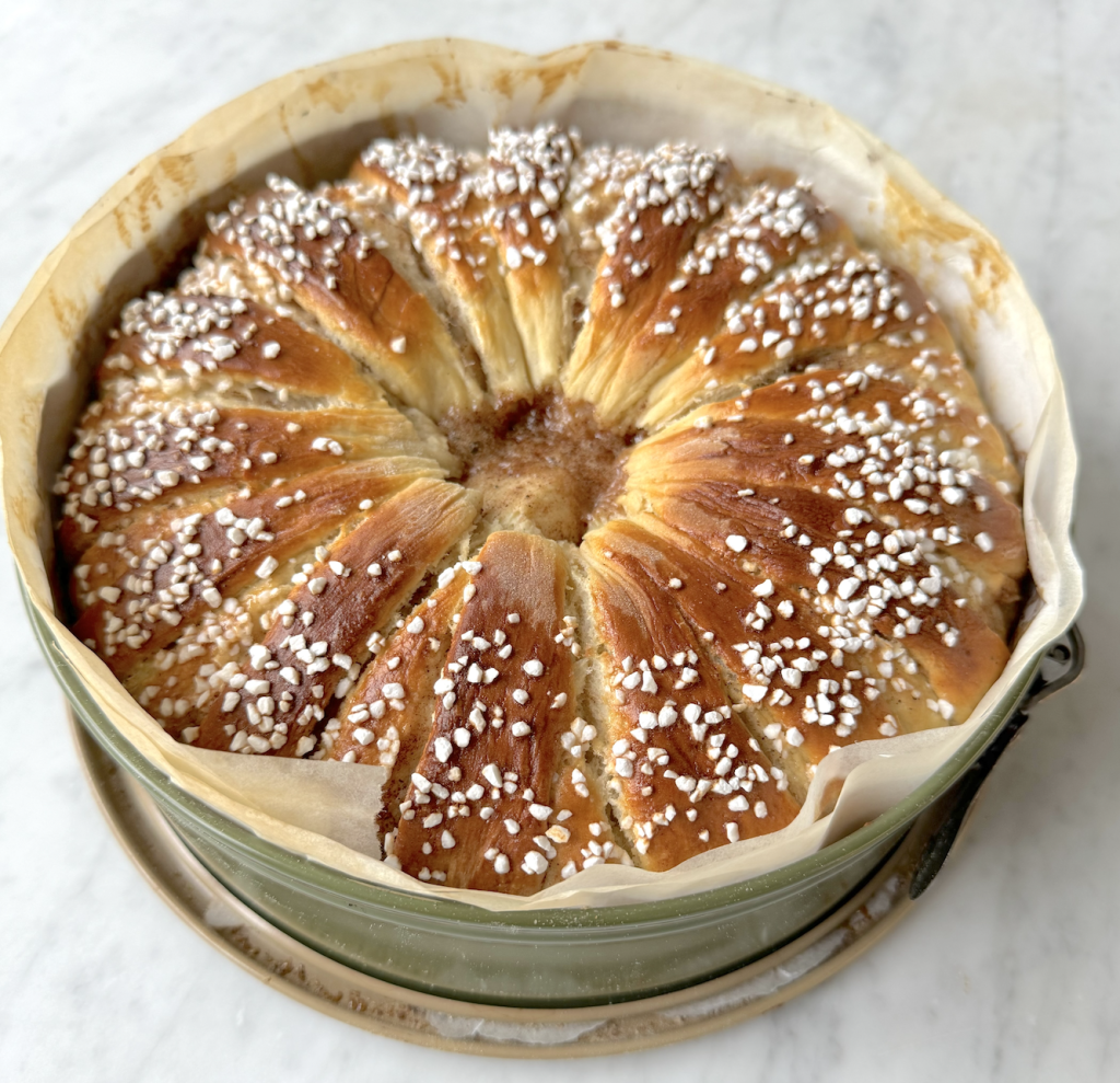 1. Deg: Smula ner jÀsten i en bunke. TillsÀtt mjölken + saffran rör och rör om tills jÀsten lösts upp. TillsÀtt smör, strösocker, Àgg, salt, kardemumma och vetemjöl, lite i taget mot slutet. Blanda ihop allt till en smidig deg och knÄda den i nÄgra minuter. LÄt degen jÀsa under bakduk i ca 45 min.