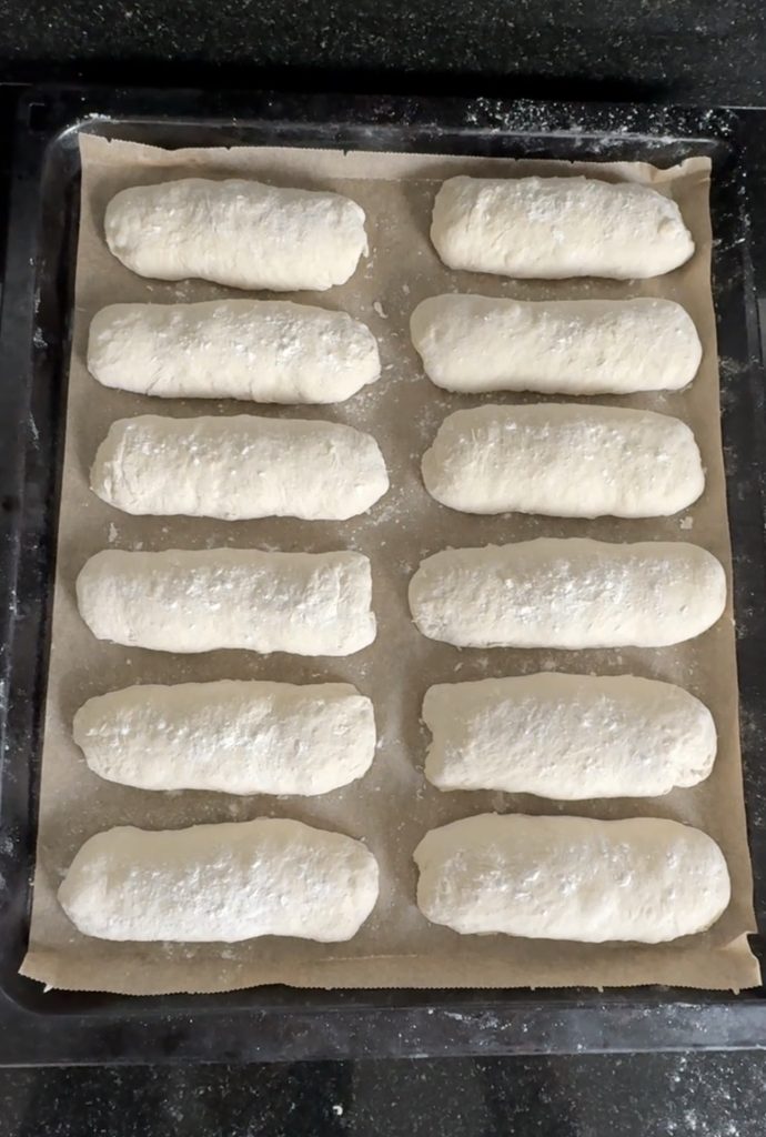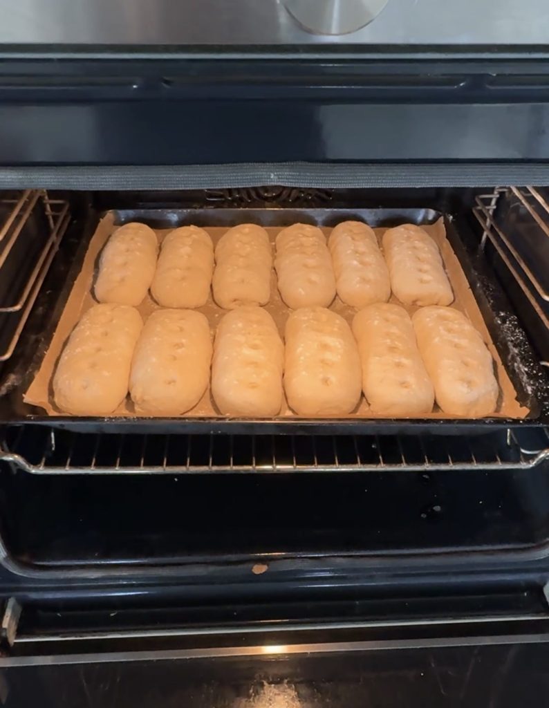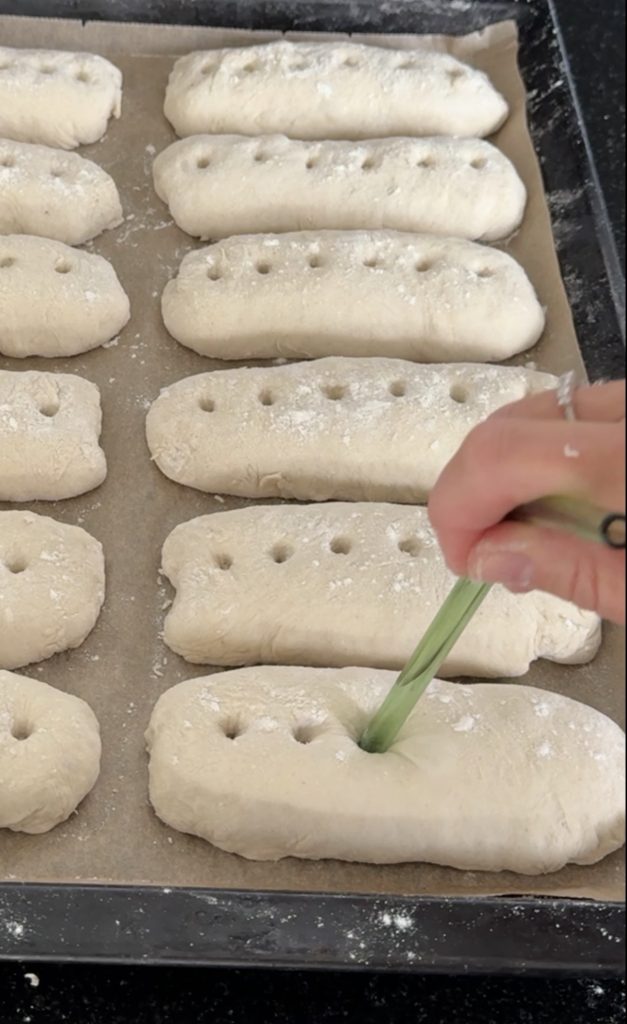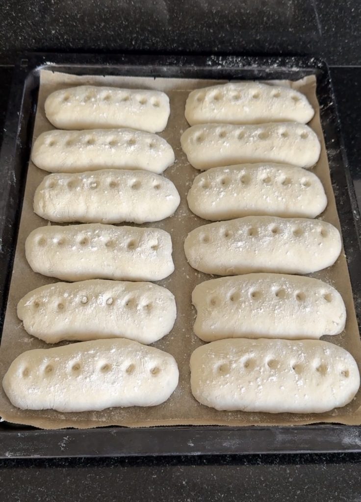 3. Strö över lite mjöl och nagga hål i dem med t ex ett sugrör. Låt dem jäsa under bakduk i ca 25 min. Sätt ugnen på 230 grader. Lägg de sista sex frallorna på en annan plåt med bakplåtspapper och nagga även dem med ett sugrör.