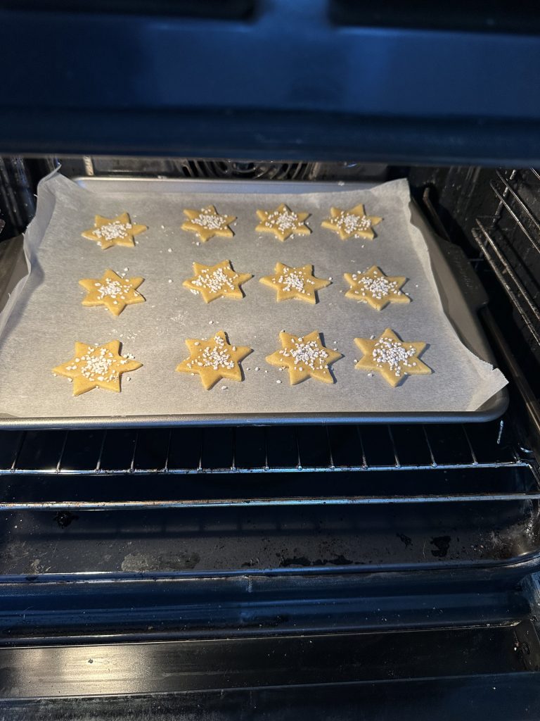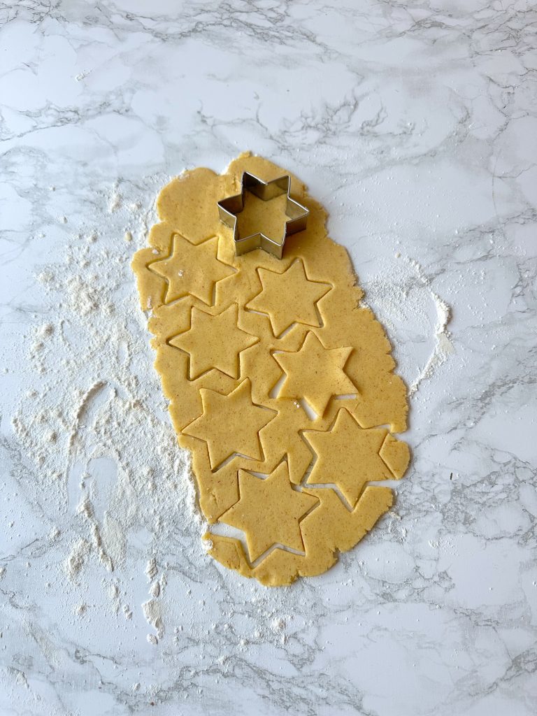 3. Stansa ut stjärnor med ett pepparkaksmått (valfri form går bra). Lägg dem på plåt med bakplåtspapper.