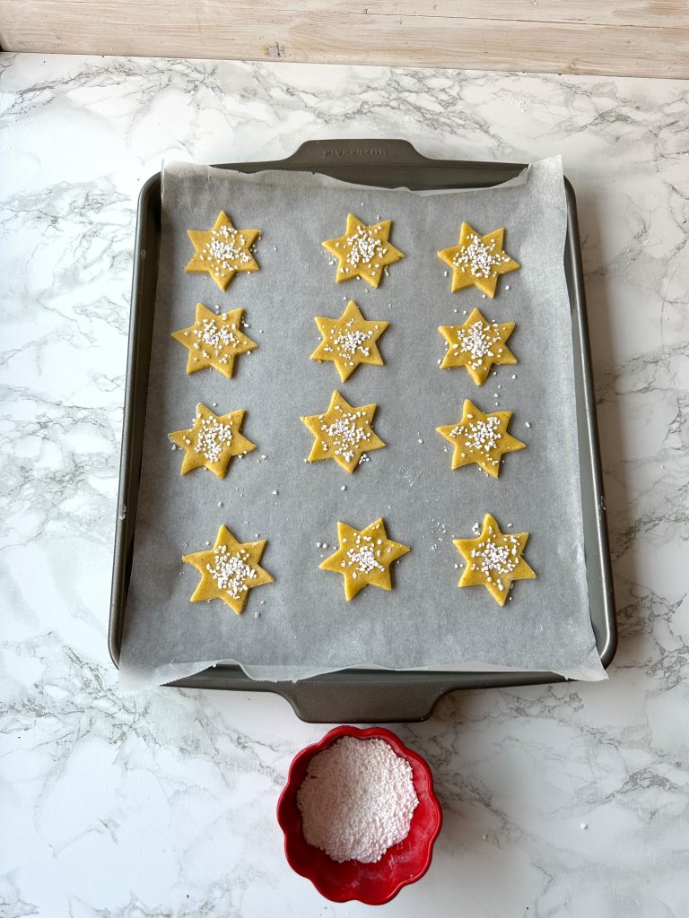 Spröda småkakor med saffranssmak och knaprigt pärlsocker på toppen. Om du inte har en stjärnform hemma kan du stansa ut med valfri form.
