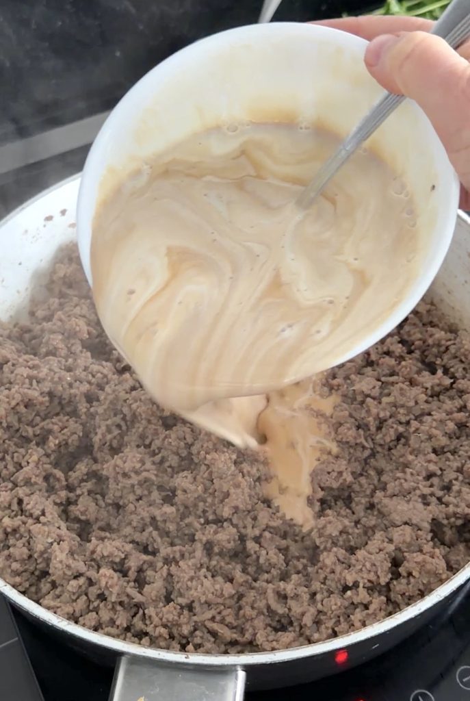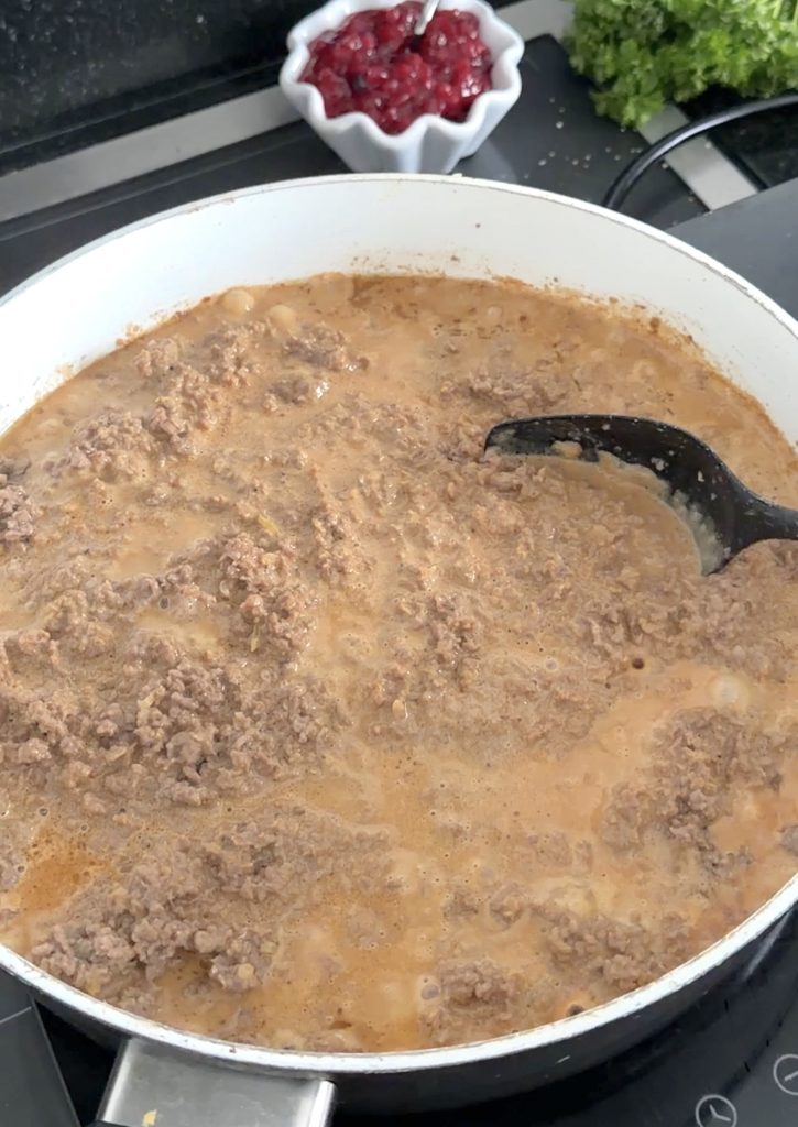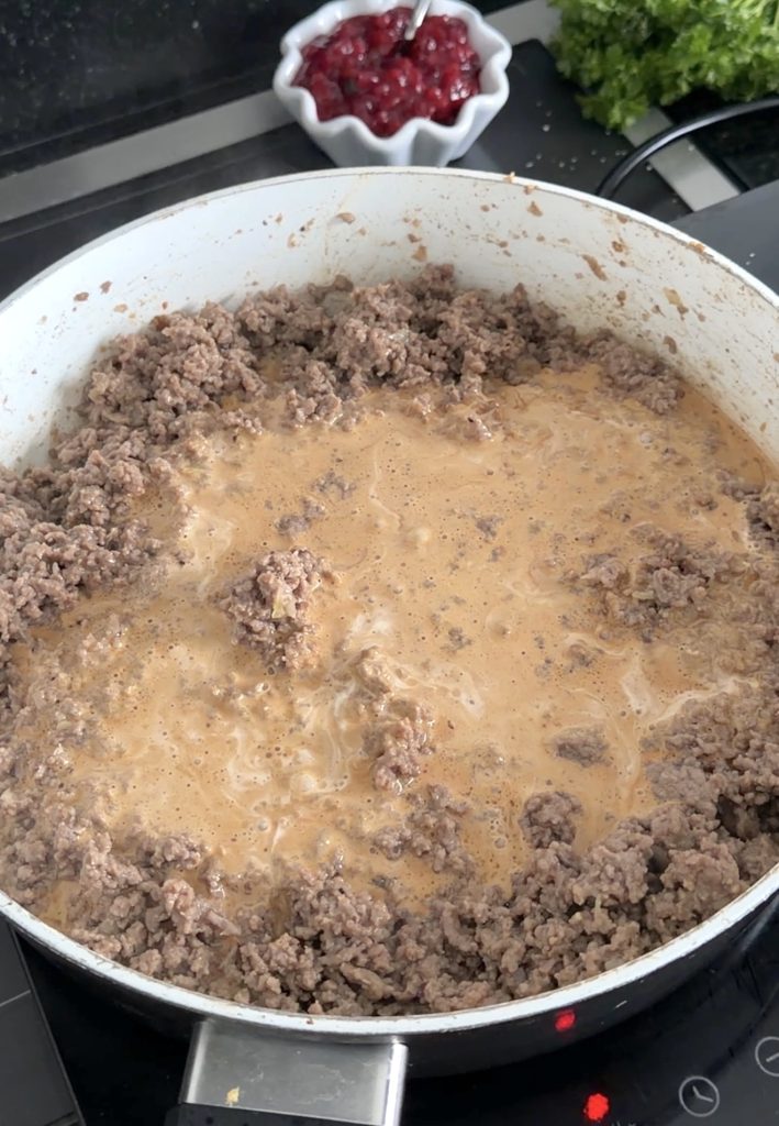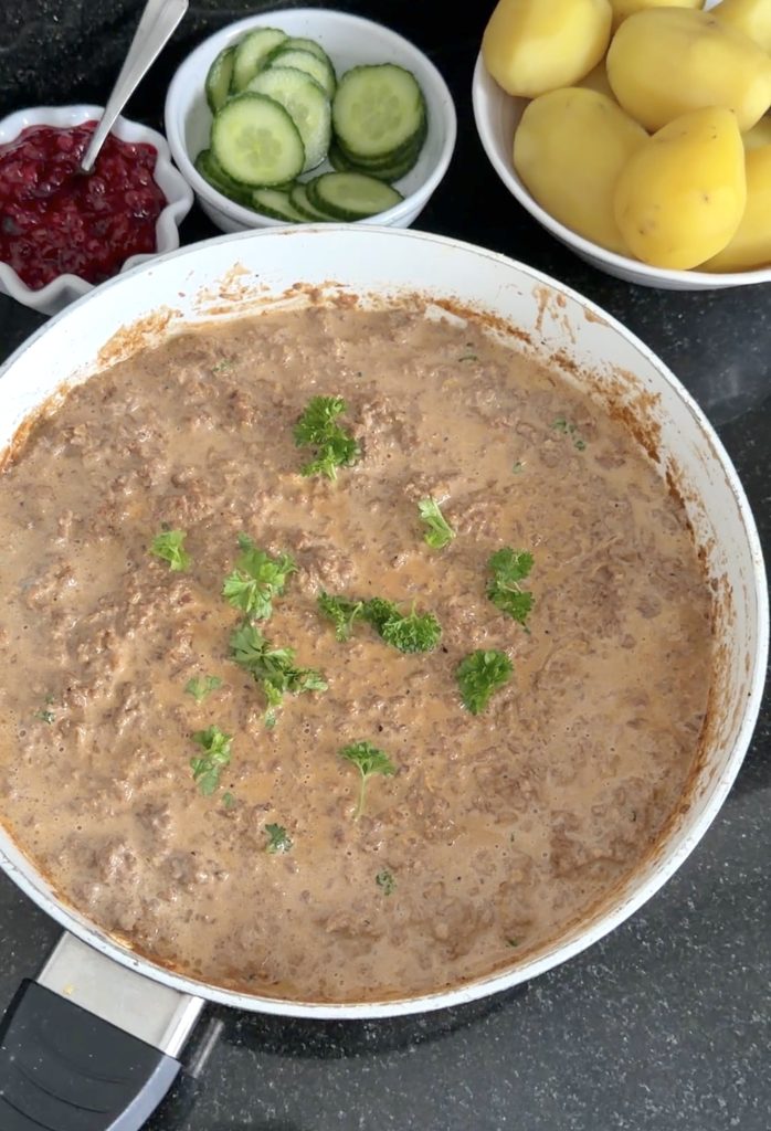 2. Gräddsås: Blanda alla ingredienser i en skål (utom salt och peppar) och rör om. Häll gräddsåsen över köttfärsen i stekpannan och låt det puttra på svag värme i några minuter. Smaka av såsen och tillsätt lite salt och peppar om det behövs.