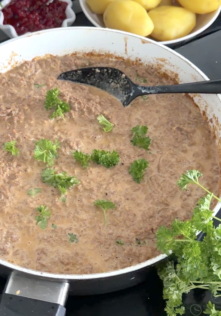 Servera gärna med kokt potatis eller potatismos, lingonsylt och inlagd gurka.