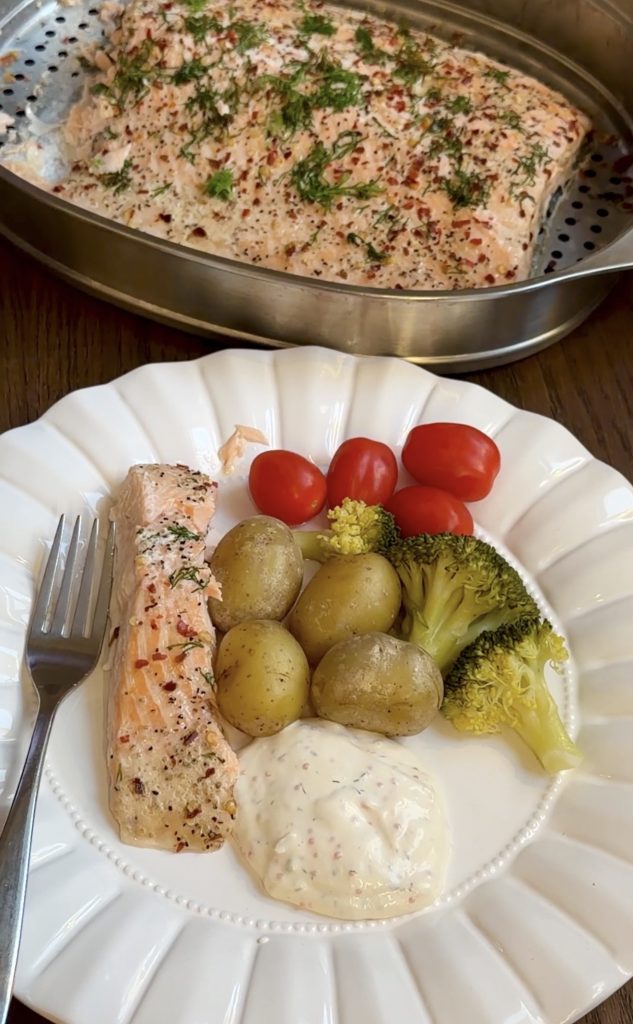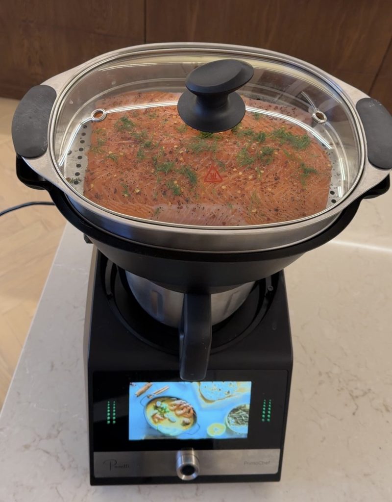 Jag har lagat en hel middag samtidigt i min Primo Chef: ångkokt lax längst upp och potatis med broccoli i lagren under. Resultatet? Otroligt saftigt och näringsrikt! 🐟🥦 Men jag stannade inte där... jag lät maskinen knåda degen till mitt fluffiga matbröd och jag bakade även en kladdkaka i den och avslutade med att vispa grädden på bara några sekunder. 🍰☁️