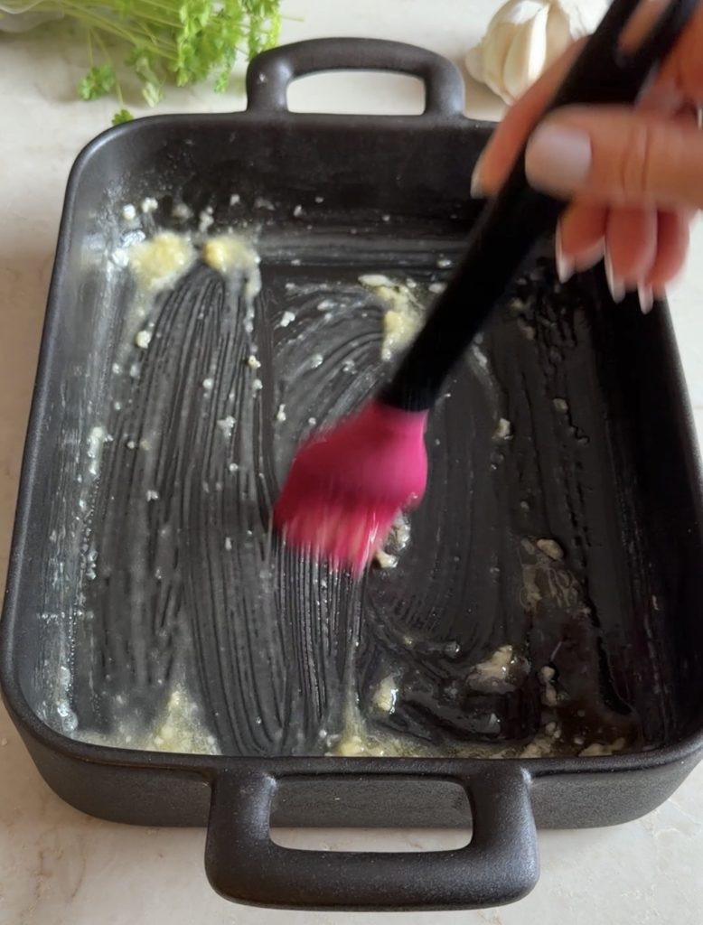 - Pensla botten på en ugnsform eller rund pajform med smält vitlökssmör.