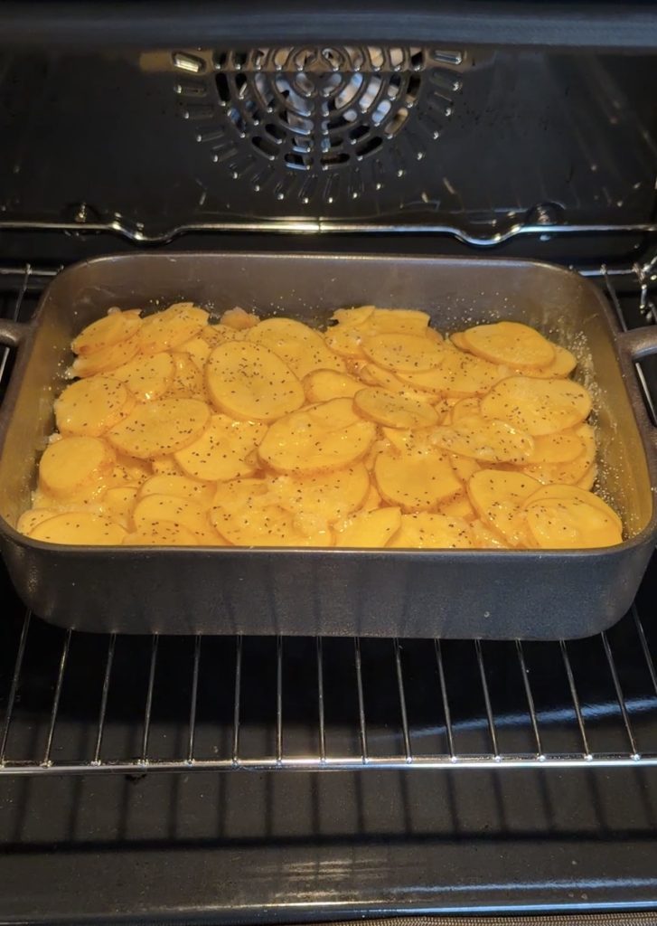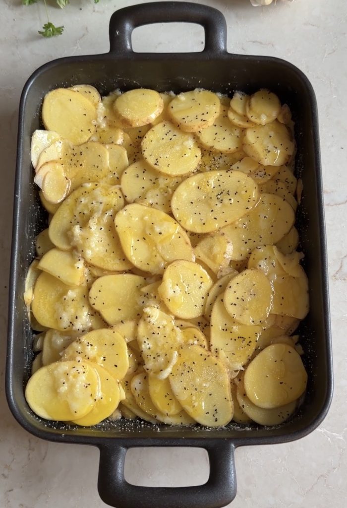 - Lägg ett lager potatis i botten på ugneformen. Ringla över hälften av smöret. Salta och peppra. Lägg på resten av potatisen, ringla över resten av smöret. Salta och peppra.