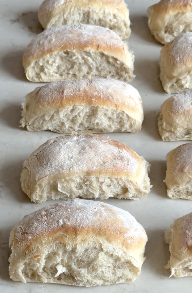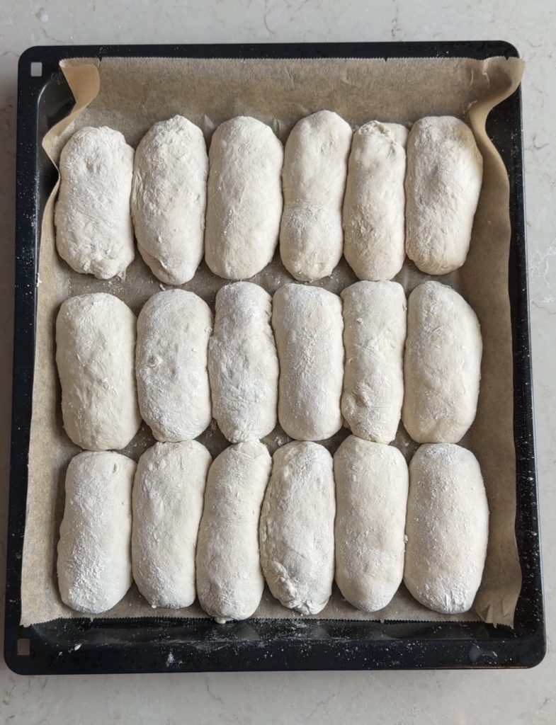 2. Dela degen i 18 bitar. Rulla dem till bollar med mjölade händer. Degen är lätt kladdig och knåda inte in mer mjöl i degen utan strö vetemjöl ovanpå degen och forma avlånga frallor.