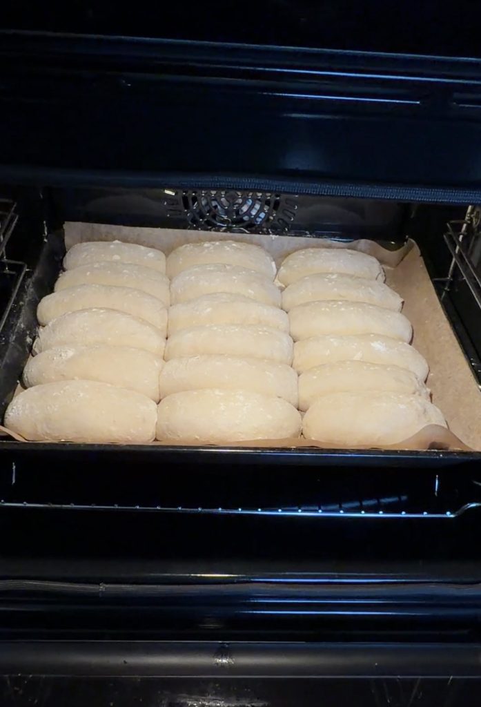3. Lägg frallorna på en ugnsplåt 6 x 3 st, klädd med bakplåtspapper. Låt dem jäsa under bakduk i ca 25 min. Sätt ugnen på 250 grader.