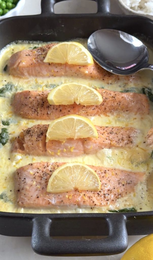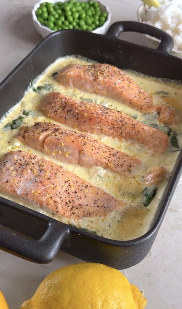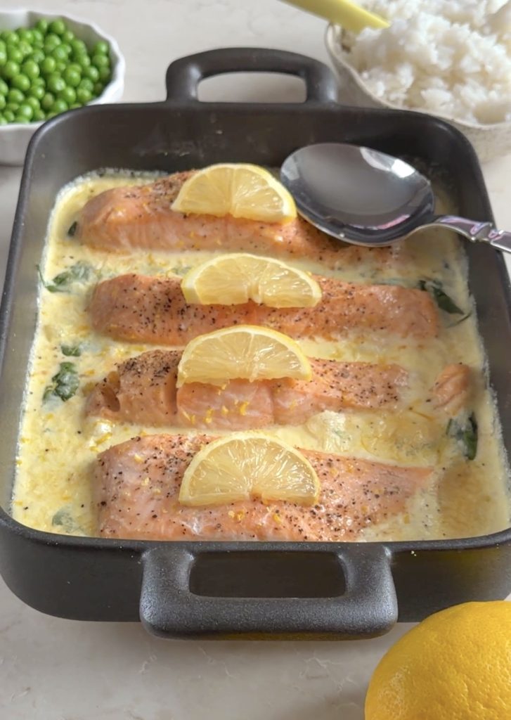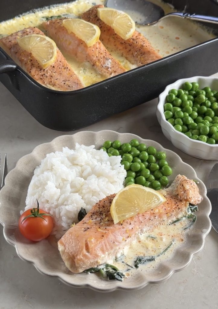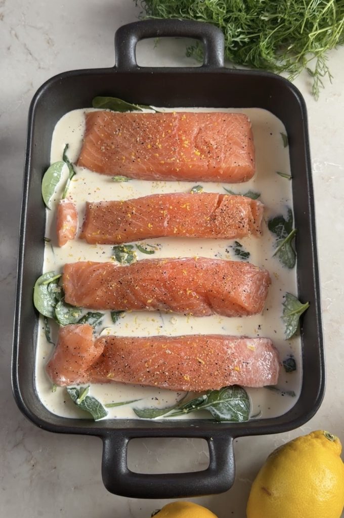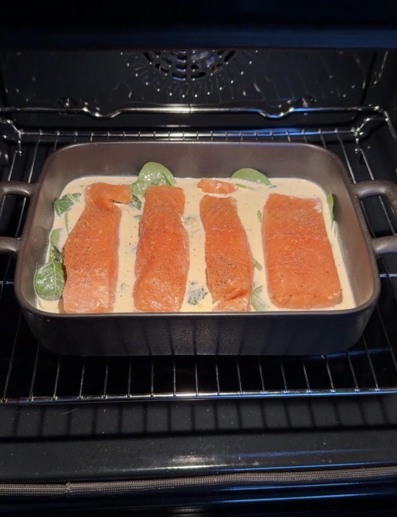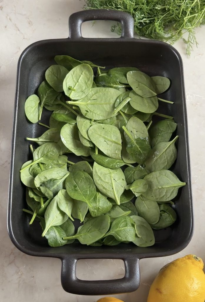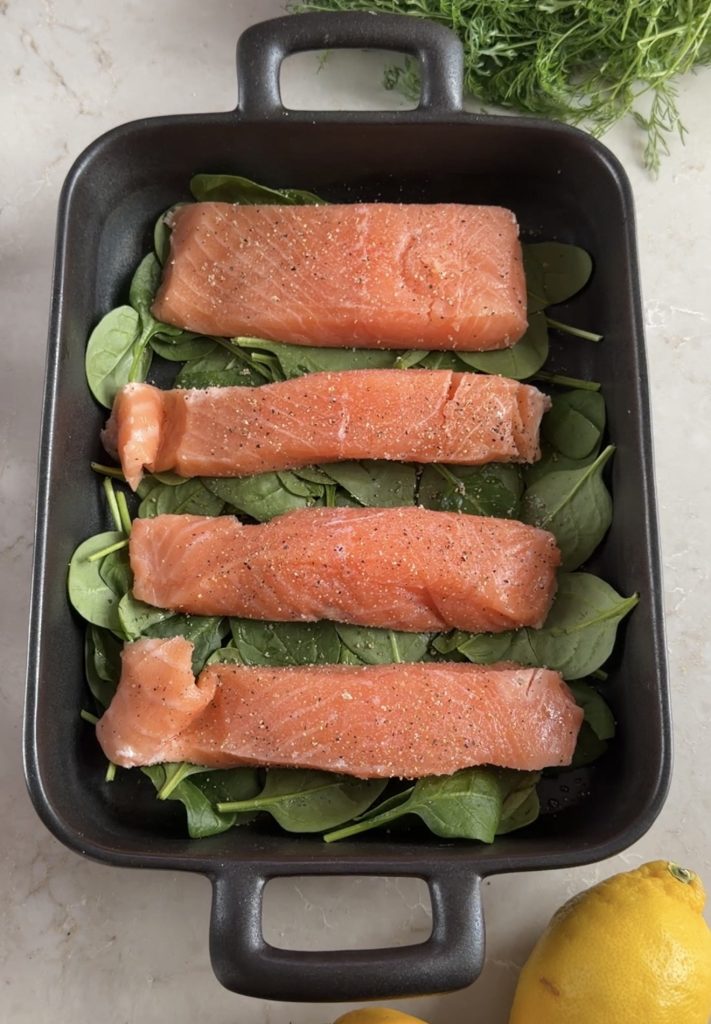 1. Sätt ugnen på 150 grader. Lägg färsk spenat i botten på ugnsform. Lägg laxbitarna ovanpå spenaten.