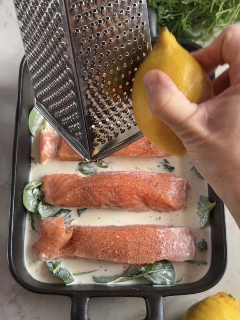 3. Blanda såsens ingredienser och häll den runt om laxbitarna. Finriv citronskal på laxen och såsen.