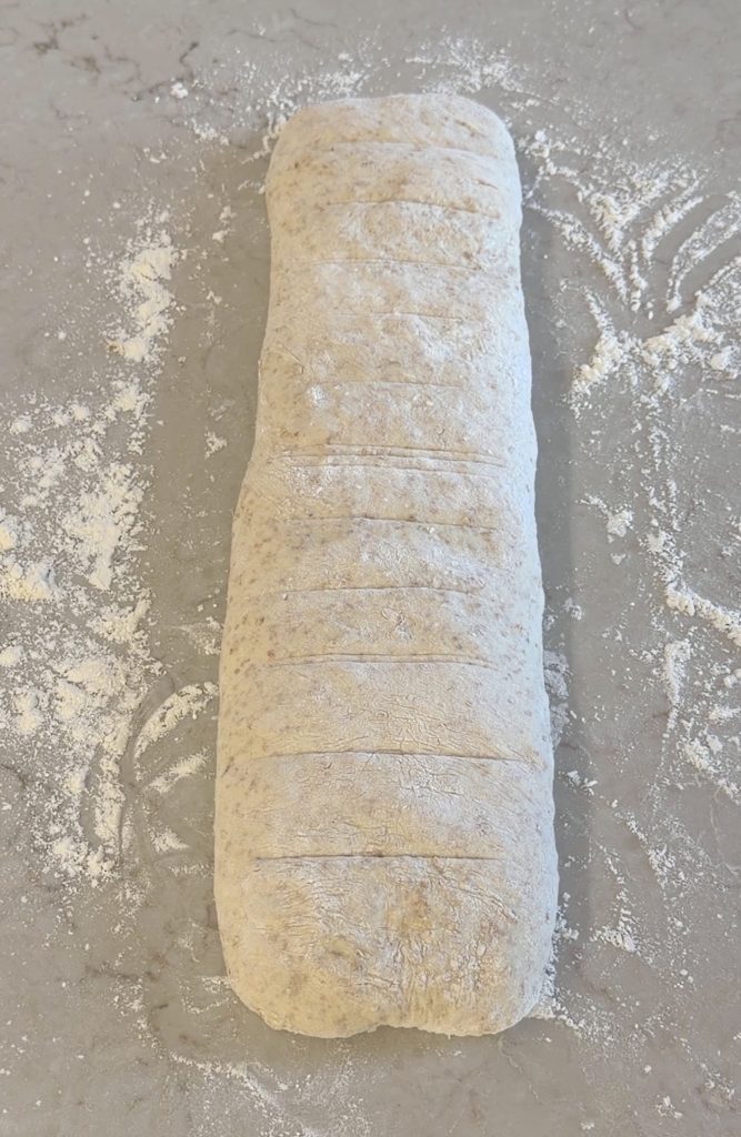 4. Lägg degen på ett mjölat bakbord. Strö över mjöl och forma den till en rektangel. Degen är lite kladdig, men om du strör ordentligt med mjöl under och över degen så kladdar det inte (brödet blir godare om degen inte är för hård och stabbig).