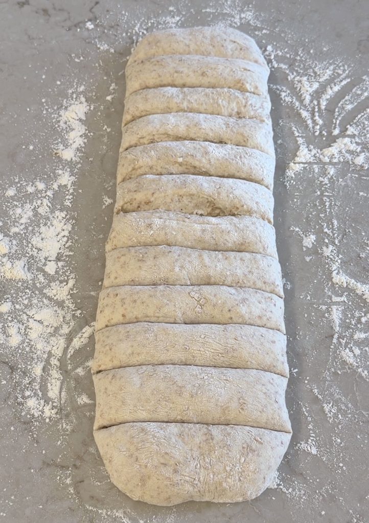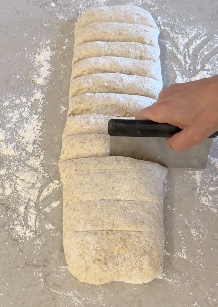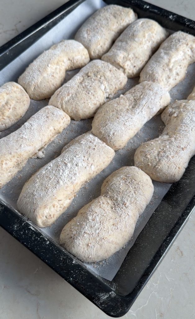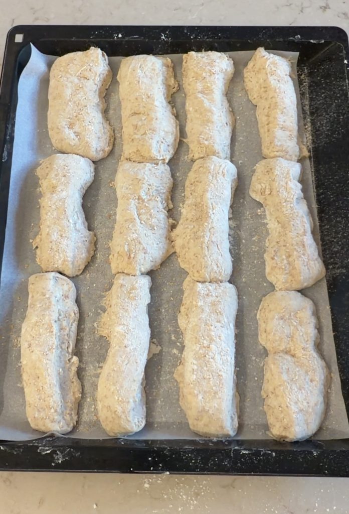 5. Skär eller klipp degen i 12 bitar och lägg dem på en ugnsplåt med bakplåtspapper. Självklart kan man forma vanliga, runda frallor av degen också om man vill det, men använd mjölade händer så degen inte fastnar i dina händer.