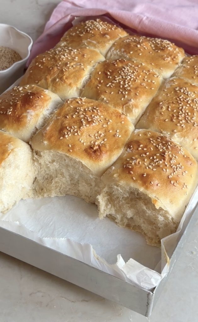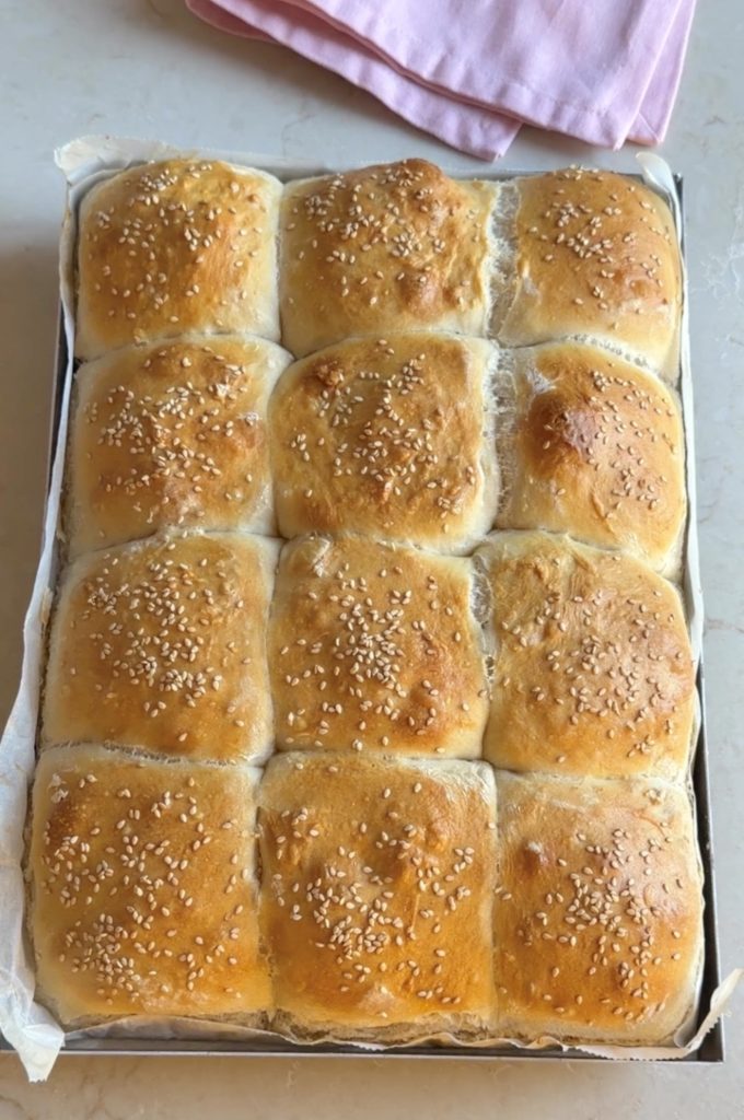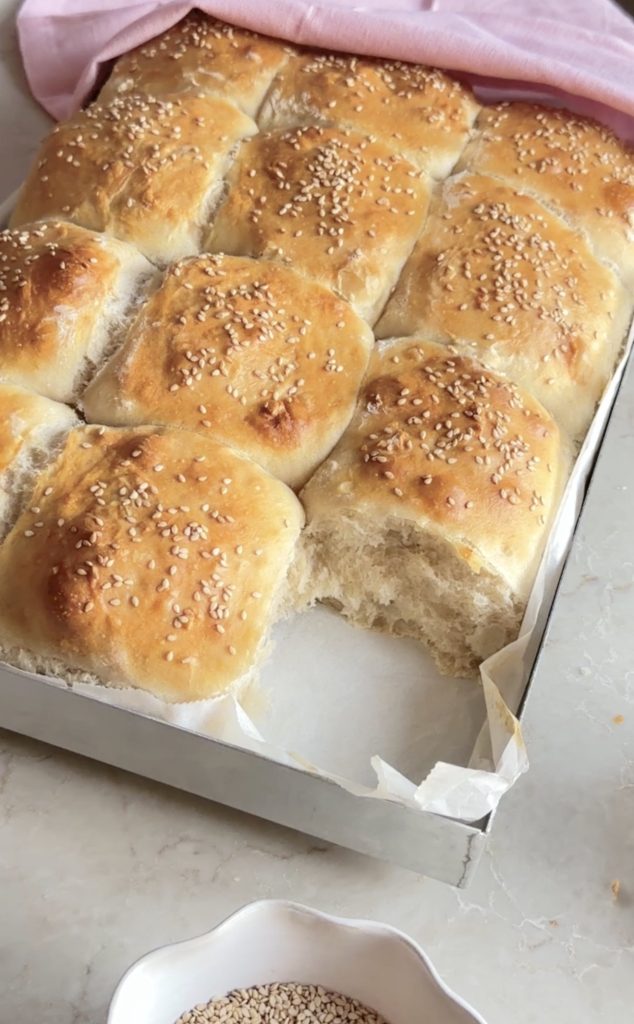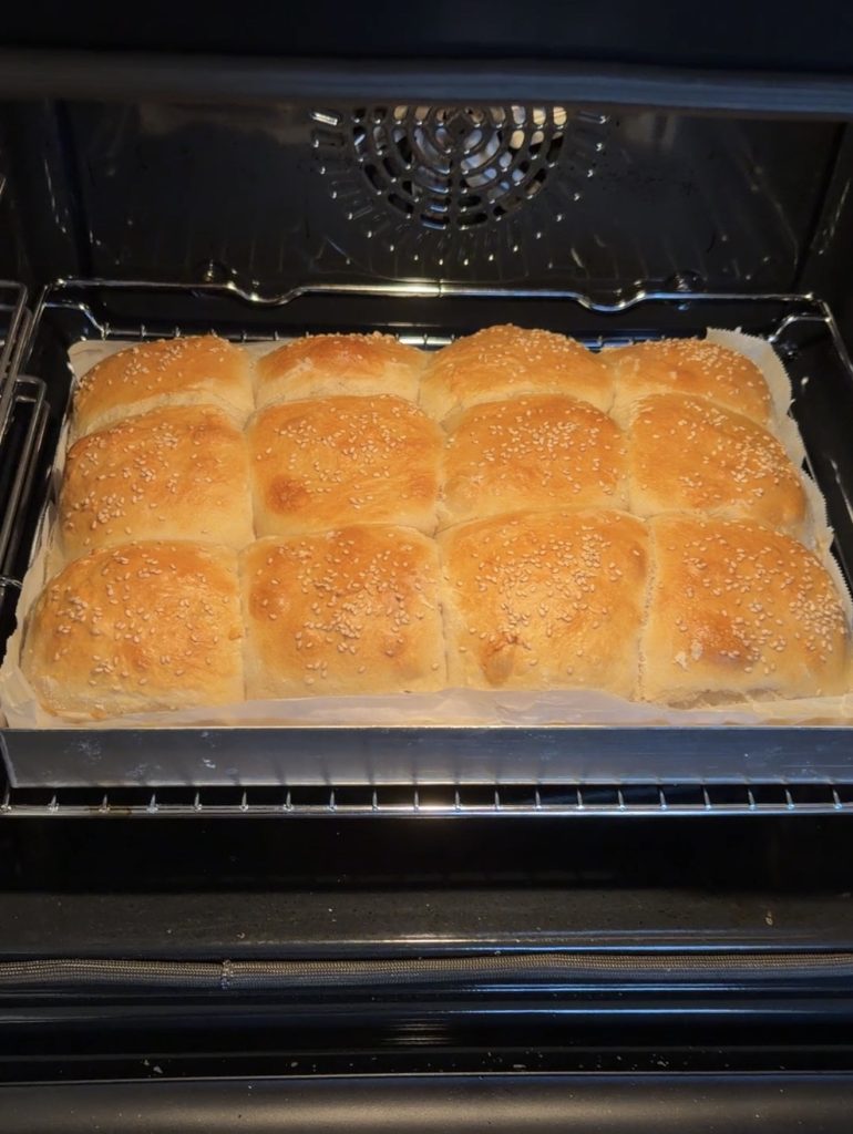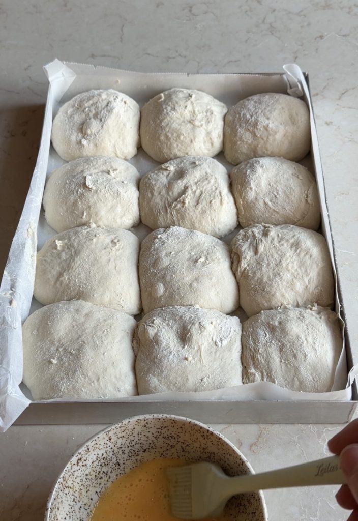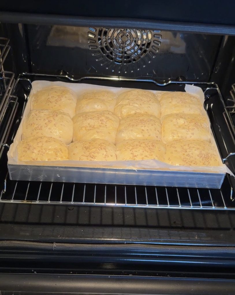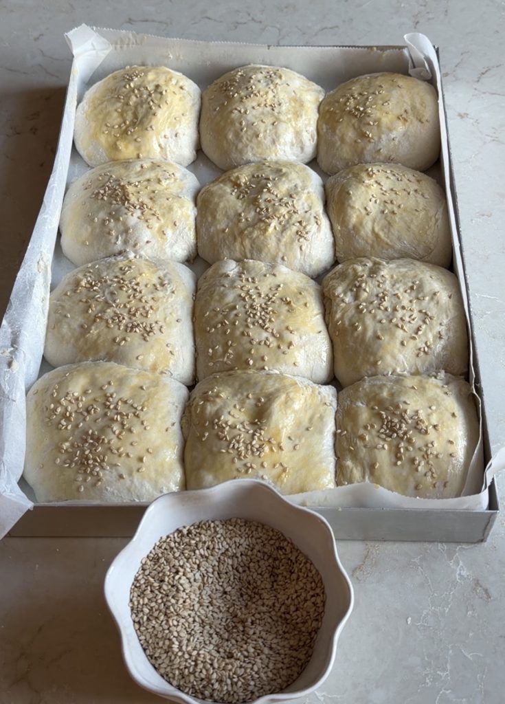 3. Lägg frallorna i Lindas ugnsplåt, klädd med bakplåtspapper. Pensla bröden med uppvispat ägg. Strö över sesamfrön. Låt dem jäsa utan bakduk i ca 30 min. Sätt ugnen på 250 grader.