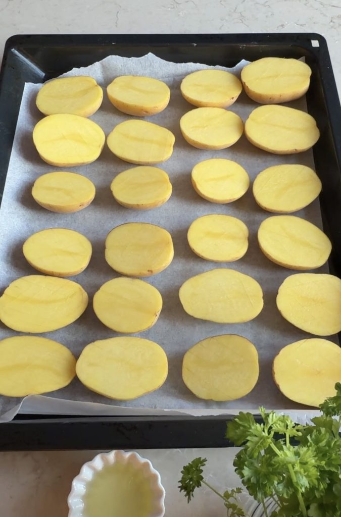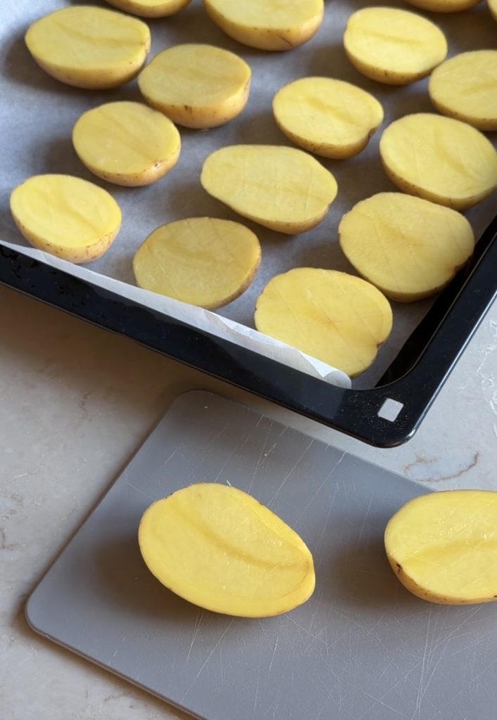 3. Lägg potatisarna med den raka, skurna sidan uppåt på en ugnsplåt med bakplåtspapper.