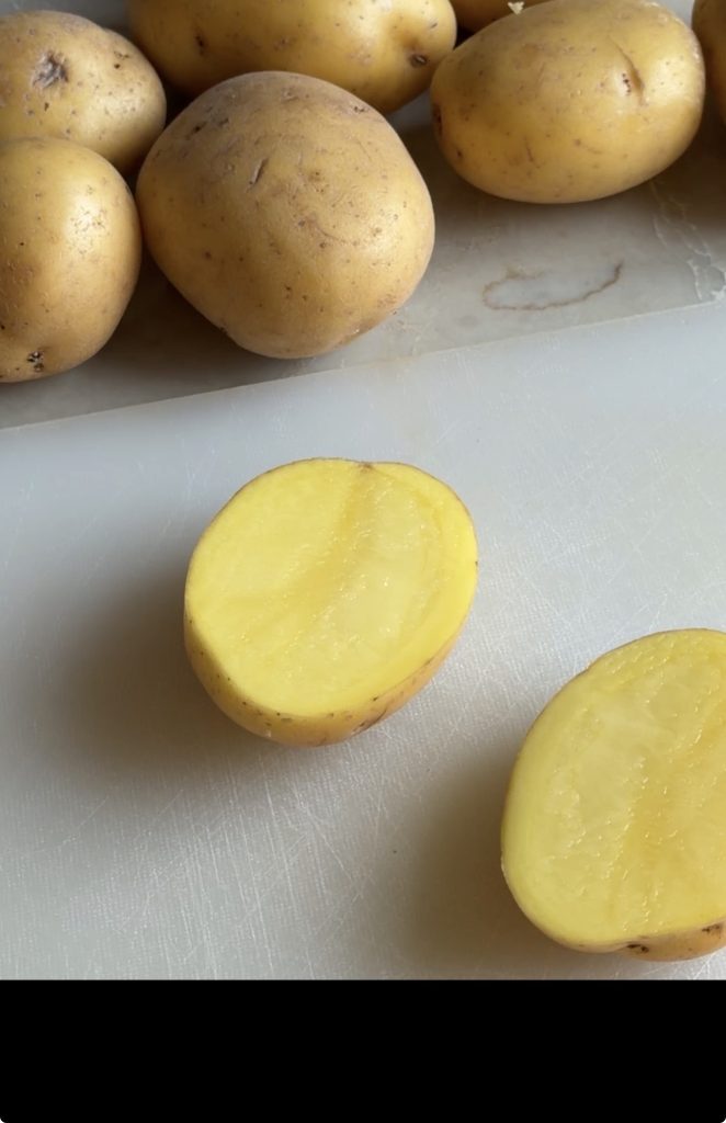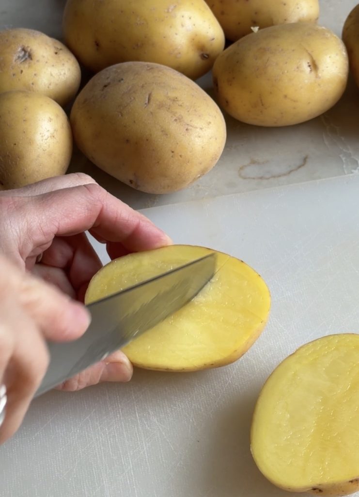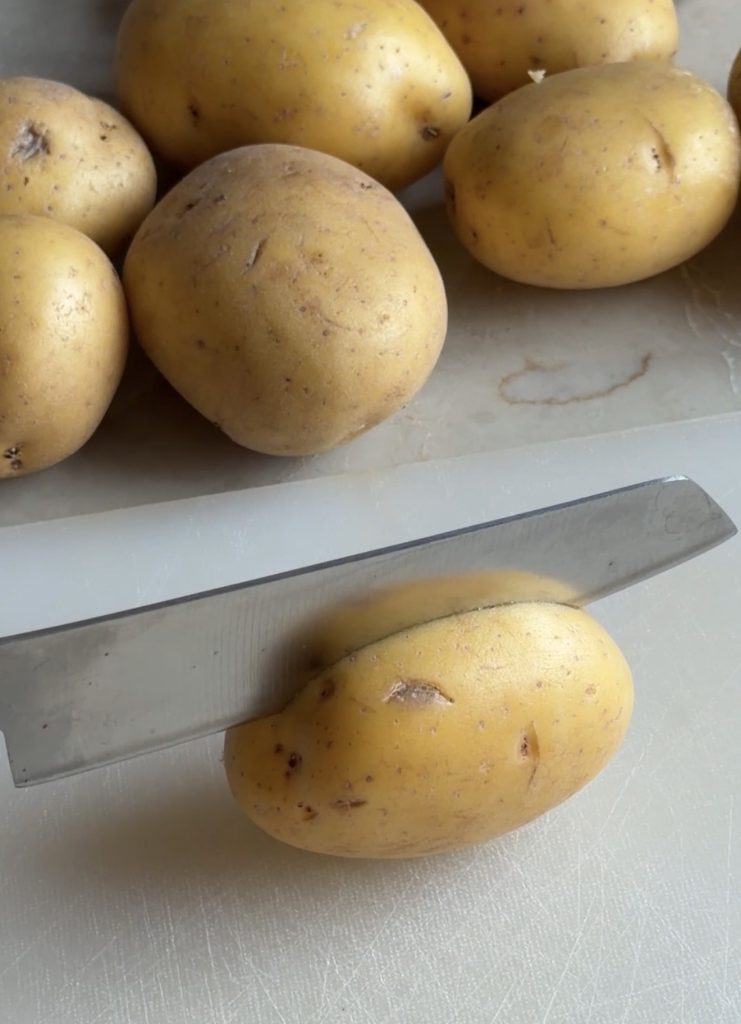 3. Lägg potatisarna med den raka, skurna sidan uppåt.