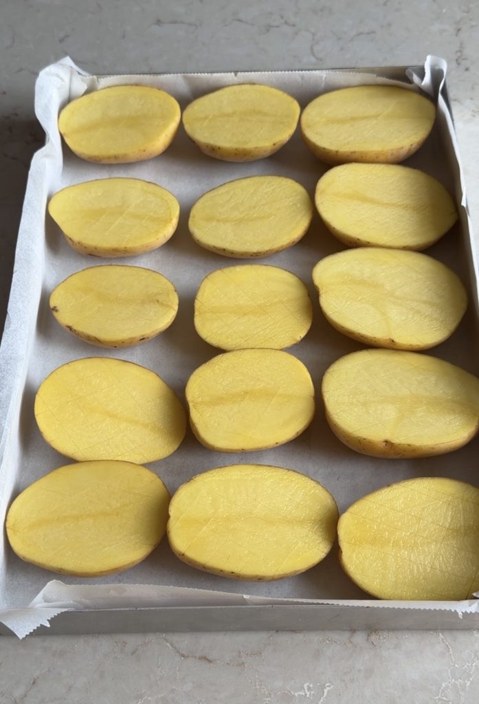 3. Lägg potatisarna med den raka, skurna sidan uppåt på en ugnsplåt med bakplåtspapper.