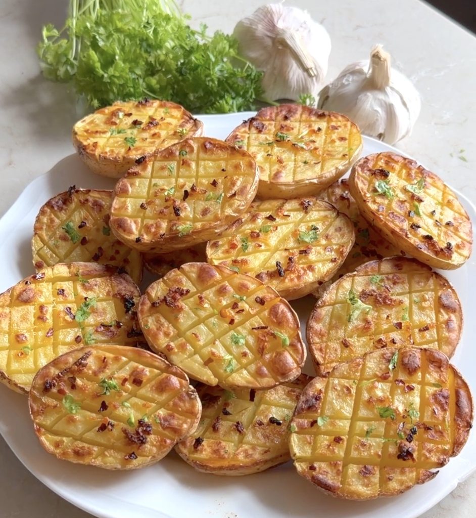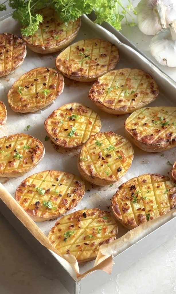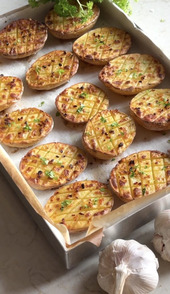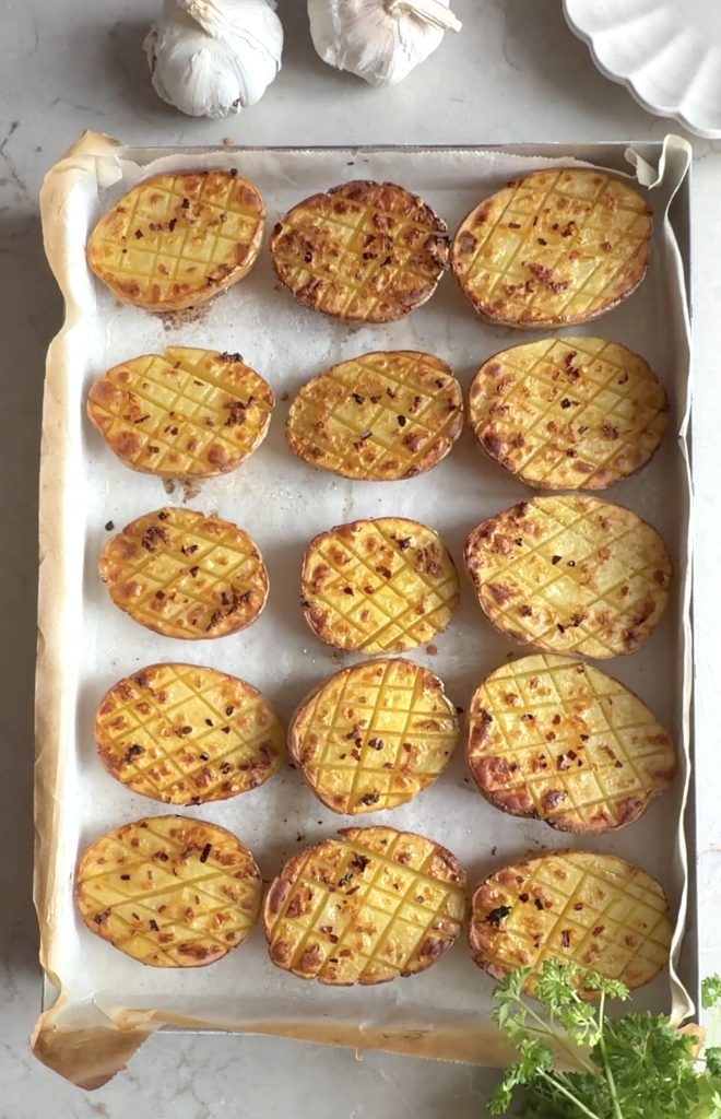 Det enklaste är ofta det godaste! Genom att skära ett rutmönster i potatishalvorna skapar du massor av små ytor som blir otroligt krispiga i ugnen. Mönstret gör också att den goda vitlöksoljan, flingsaltet och hettan från chiliflingorna sjunker in i potatisen istället för att bara ligga på ytan.