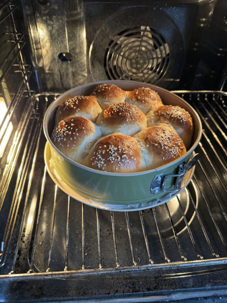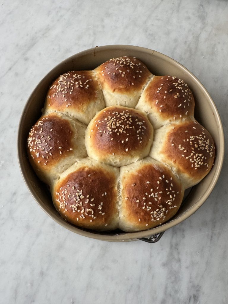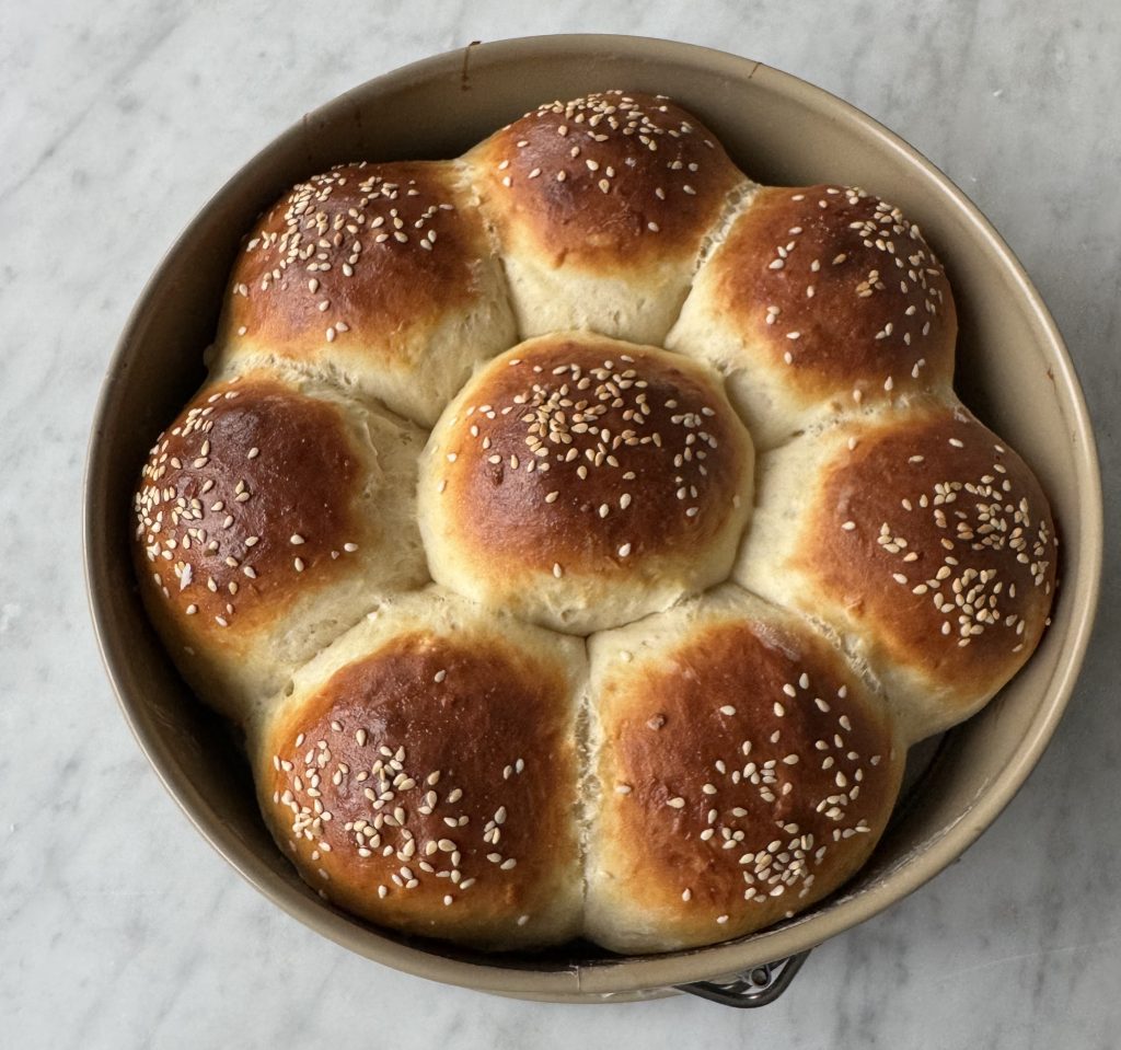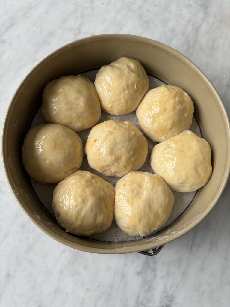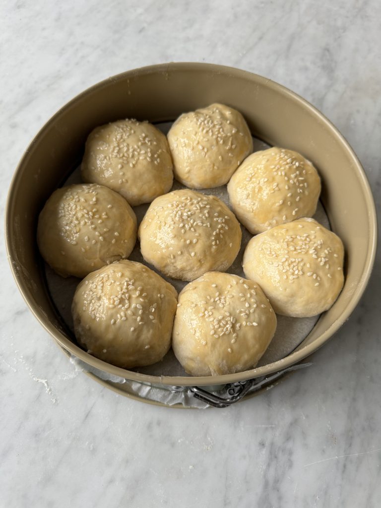 3. Dela degen i åtta bitar och forma dem till bollar. Lägg dem i springformen.  Pensla bröden med uppvispat ägg och strö över sesamfrön.