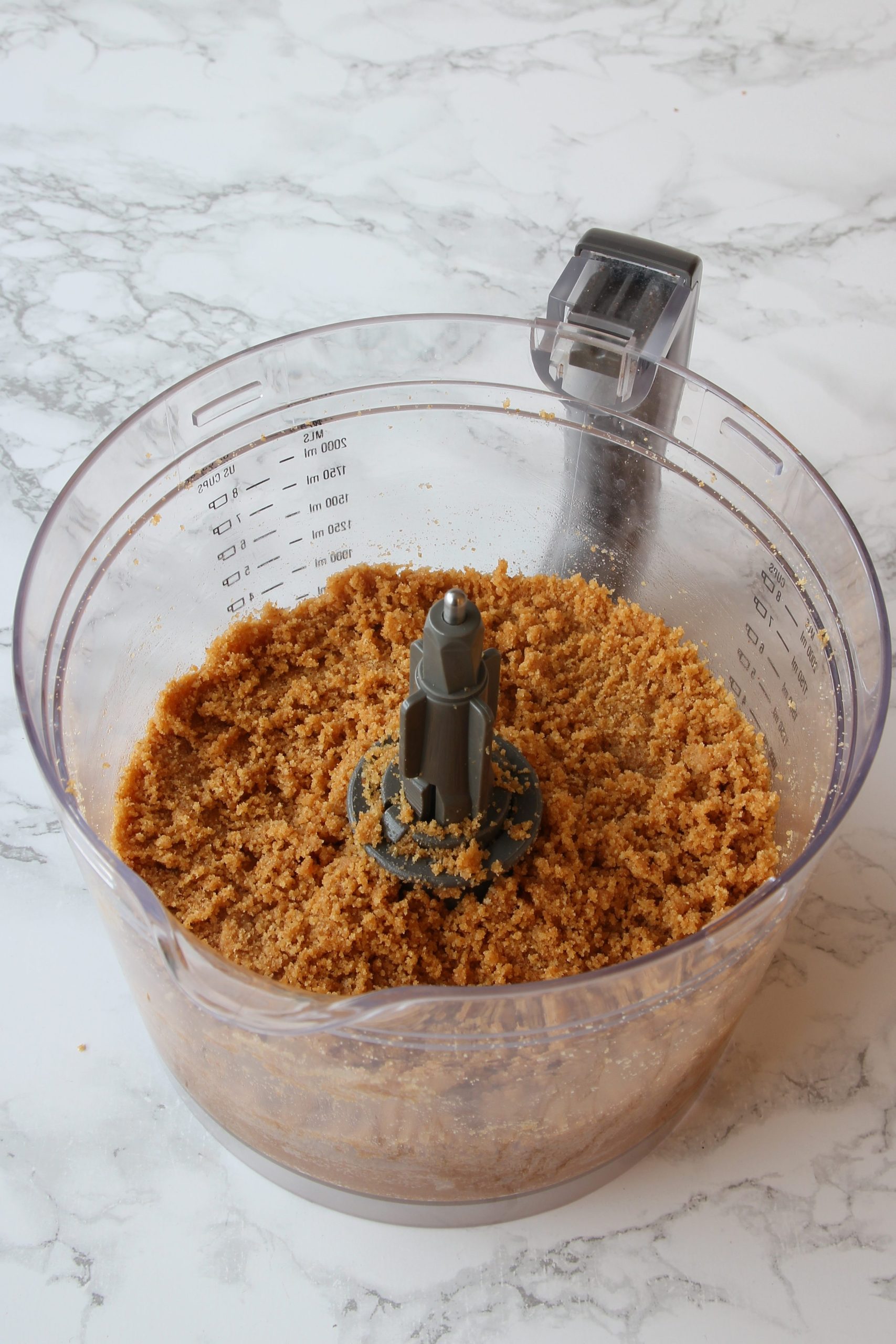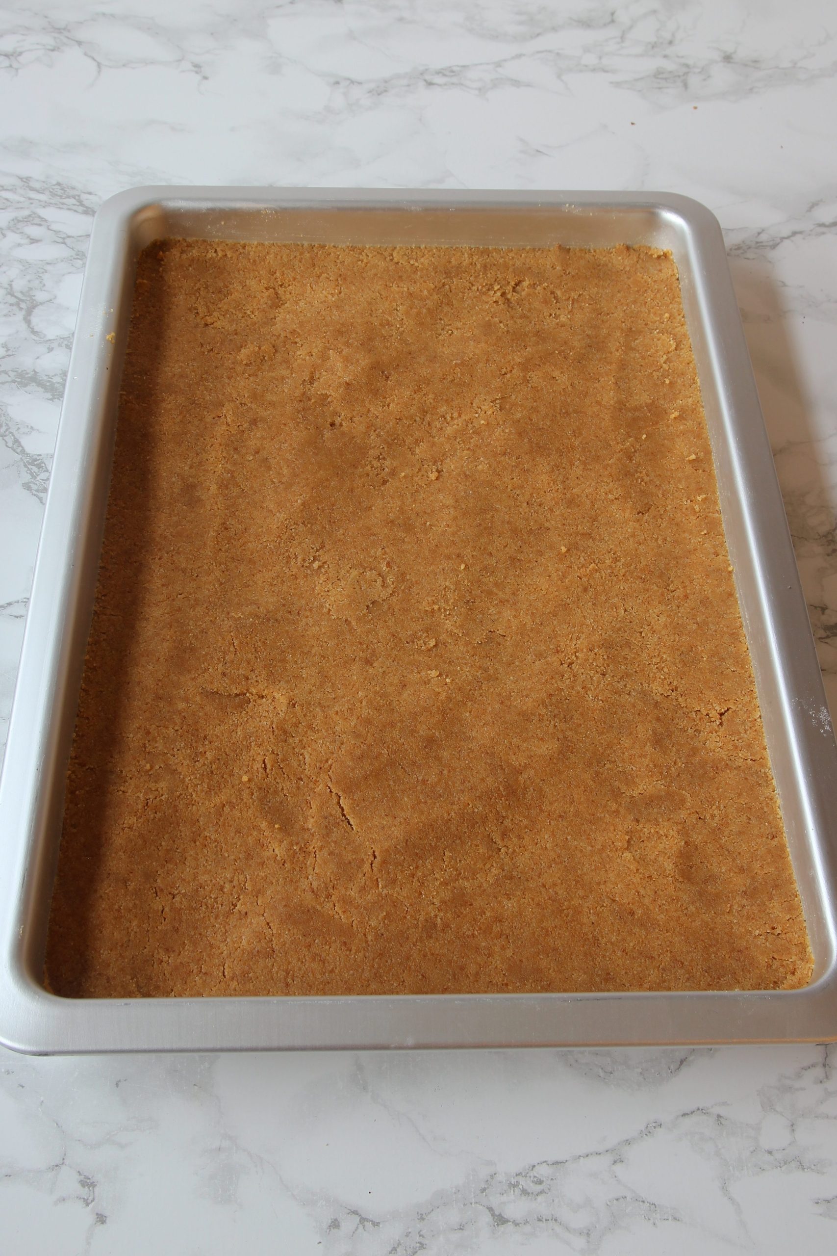 - Smula sönder kexen och blanda dem med smöret till en smulig blandning. Tryck ner smuldegen i botten på en rektangulär form, ca 18 x 23 cm. Ställ formen i kylen i ca 15 min.