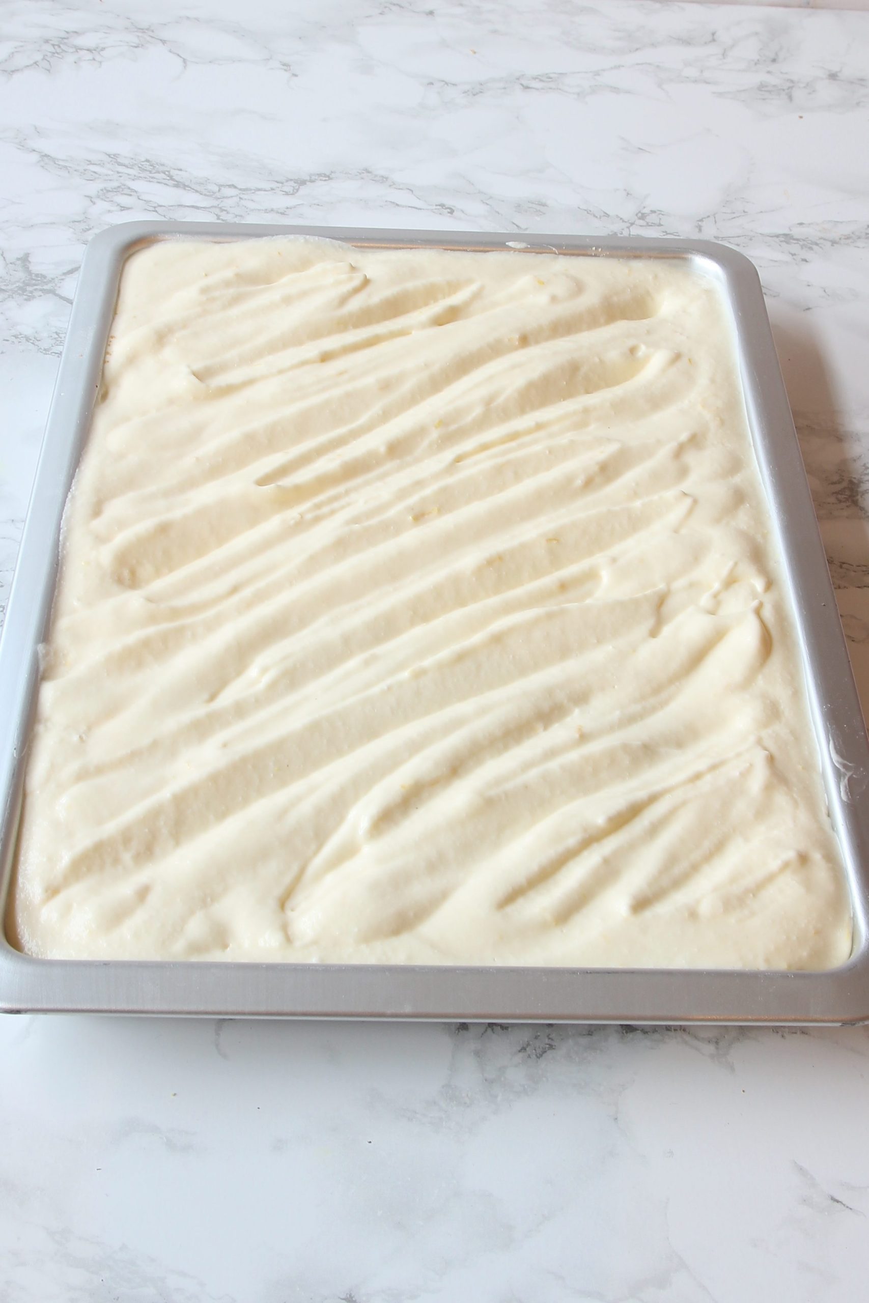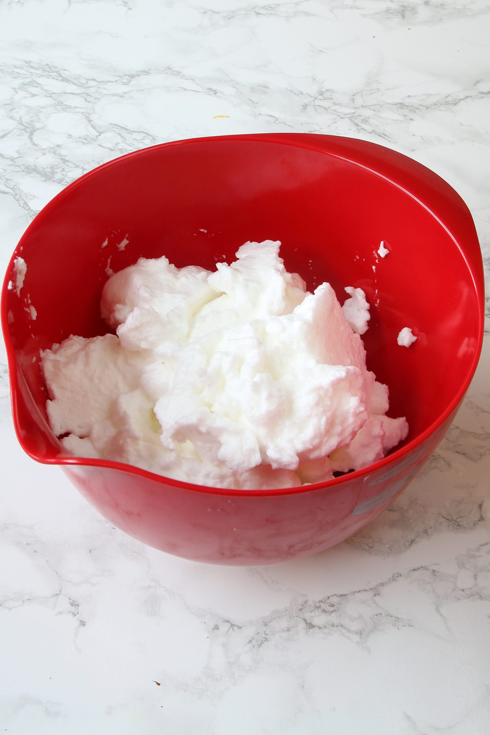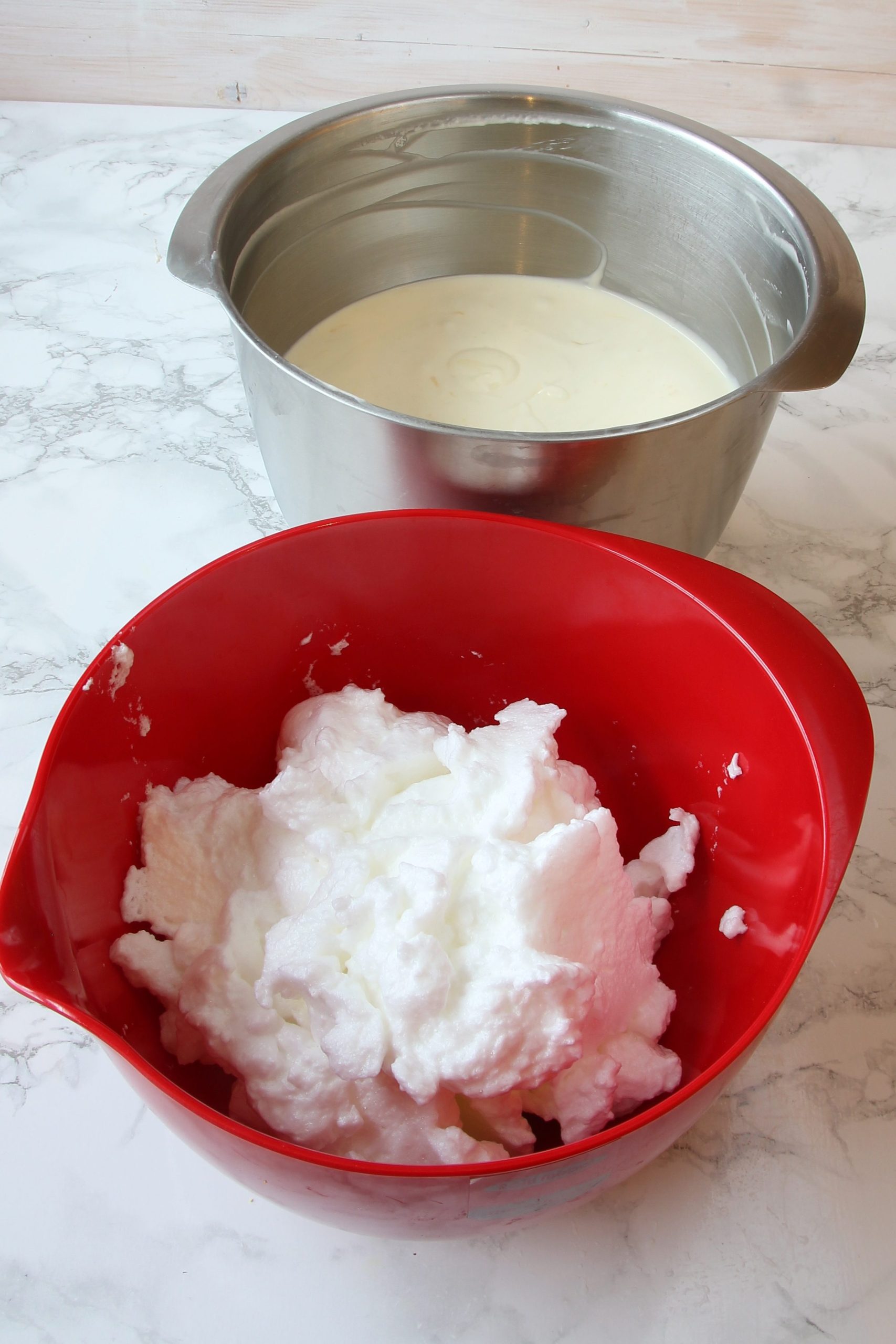 - Blanda ägggulor, färskosten, vispgrädde, florsocker, vaniljsocker och citronskal till en slät smet. Vispa äggvitorna till ett hårt skum och rör ner dem i smeten.
